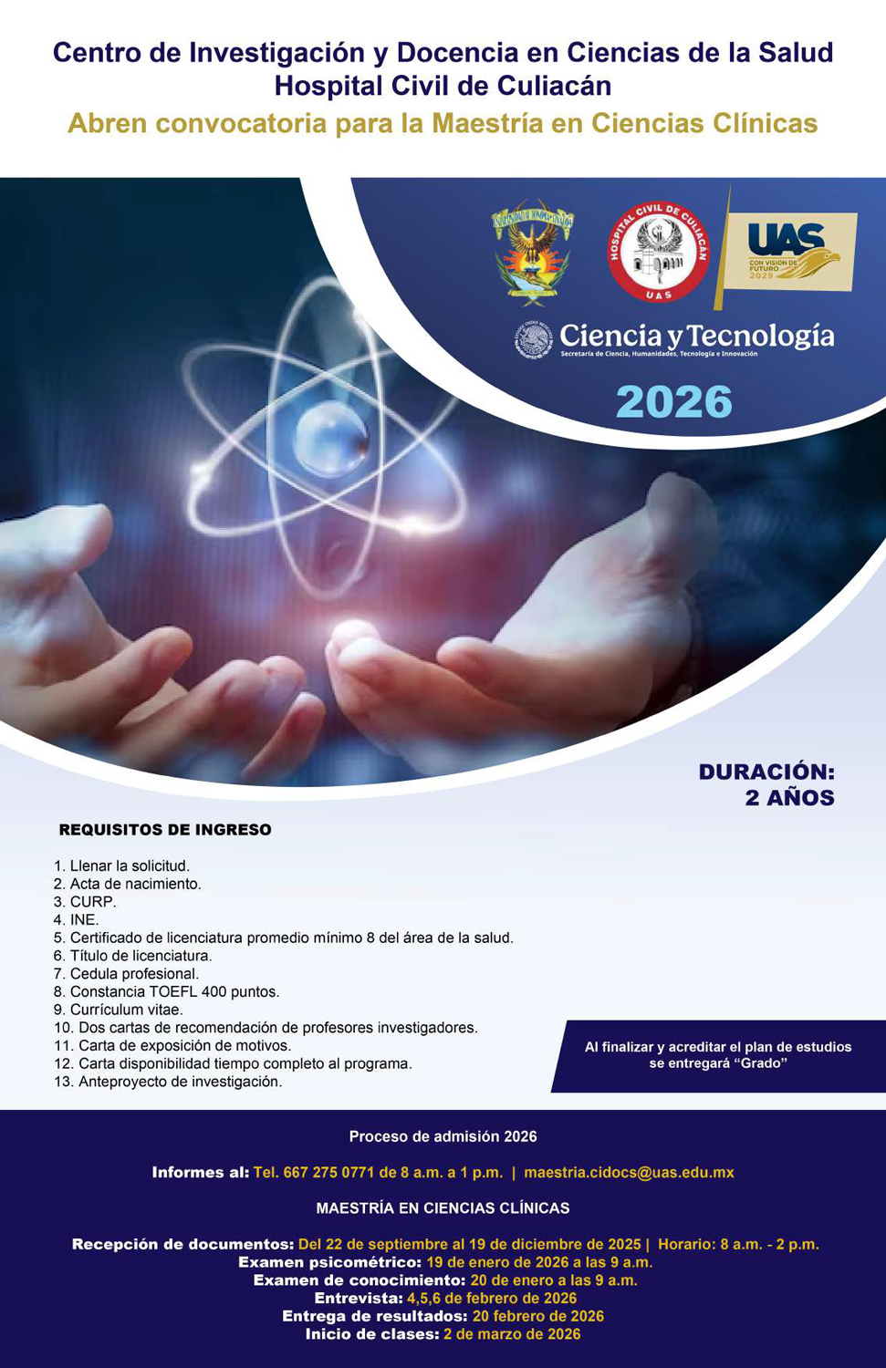 Con el propósito de preparar personal de alto nivel académico en el área de las Ciencias de la Salud y disciplinas afines, con una sólida formación teórica y metodológica en el campo de la investigación clínica, con orientación hacia la generación de nuevos conocimientos, el Centro de Investigación y Docencia en Ciencias de la Salud (CIDOCS) de la Universidad Autónoma de Sinaloa (UAS), está convocando a una edición más de la Maestría en Ciencias Clínicas, informó el doctor Israel Martínez Félix.