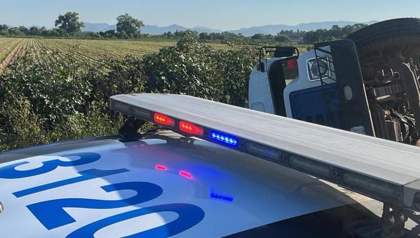 El percance se registró cuando un camión que transportaba jornaleros agrícolas colisionó con un vehículo particular. De acuerdo con los primeros reportes, tras el impacto el conductor del autobús perdió el control del volante, lo que provocó que la unidad saliera del camino y volcara sobre su lado derecho.