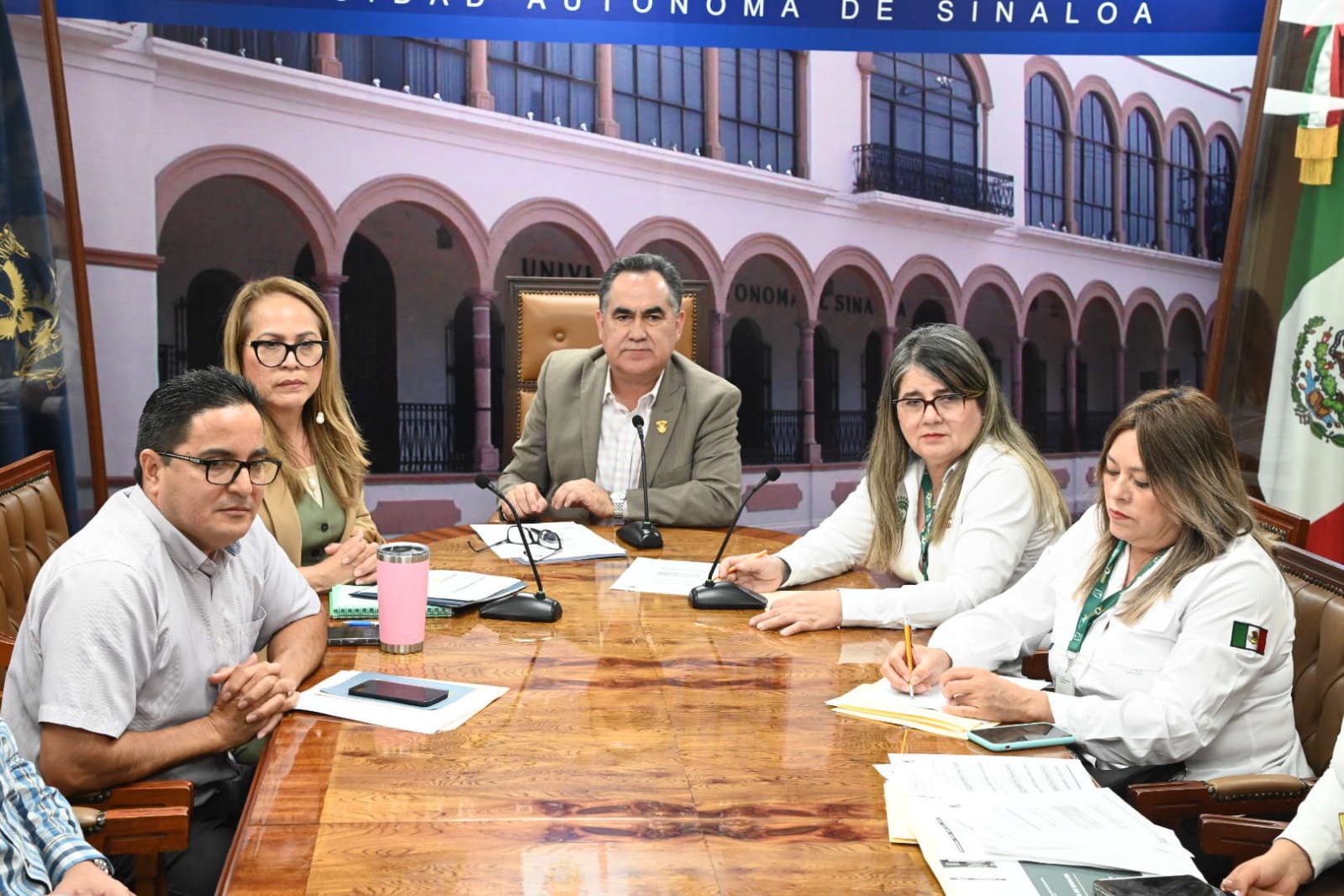 La reunión estuvo encabezada por el Rector, doctor Jesús Madueña Molina, la delegada del IMSS en Sinaloa, doctora Tania Clarissa Medina López y vía remota la Directora de Incorporación y Recaudación del IMSS, maestra Luisa Obrador Garrido.