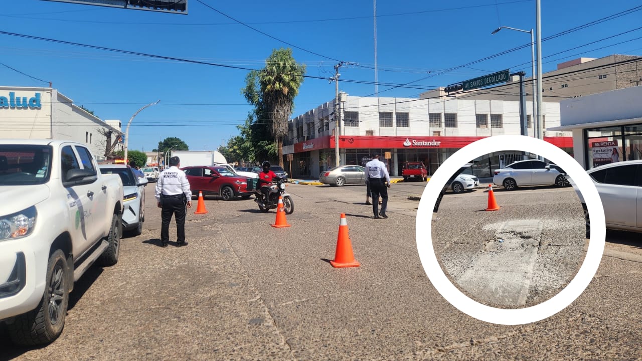 Los Mochis.- En atención a los reportes ciudadanos, el alcalde de Ahome, Antonio Menéndez de Llano Bermúdez, acudió este miércoles al cruce de la calle Álvaro Obregón y la avenida Santos Degollado, acompañado de personal de Obras Públicas y la Dirección de Tránsito Municipal, para evaluar el hundimiento detectado en la zona.