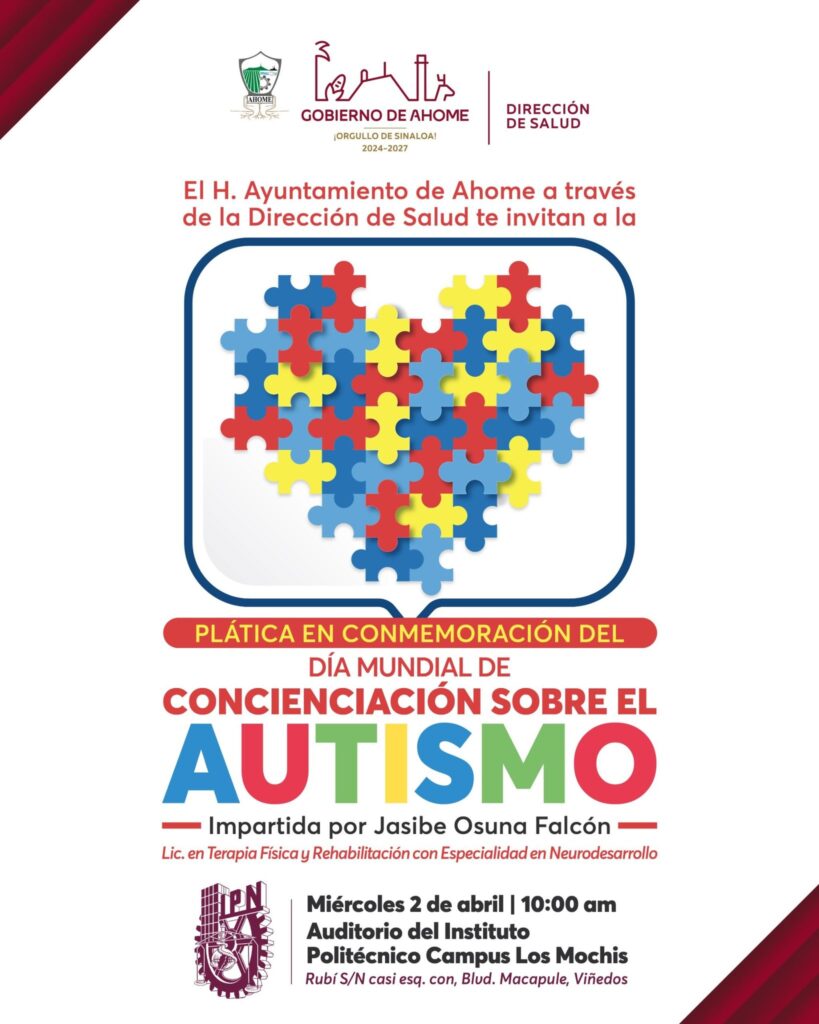 En ese sentido, el Ayuntamiento de Ahome, a través de la Dirección de Salud, organizará una plática especial para sensibilizar a la comunidad sobre este trastorno del neurodesarrollo. El evento se llevará a cabo el miércoles 2 de abril a las 10:00 a.m. en el Auditorio del Instituto Politécnico Nacional Campus Los Mochis, ubicado sobre la calle Rubí S/N, casi esquina con Boulevard Macapule, Viñedos