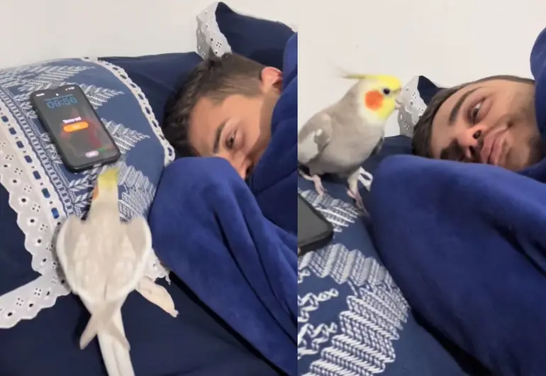 El hombre, aún somnoliento, apaga rápidamente el dispositivo. Pero lo que ocurre a continuación sorprende a todos: en cuanto la alarma se apaga, su loro empieza a imitar el mismo sonido con una precisión asombrosa, provocando confusión y diversión entre quienes ven el video.