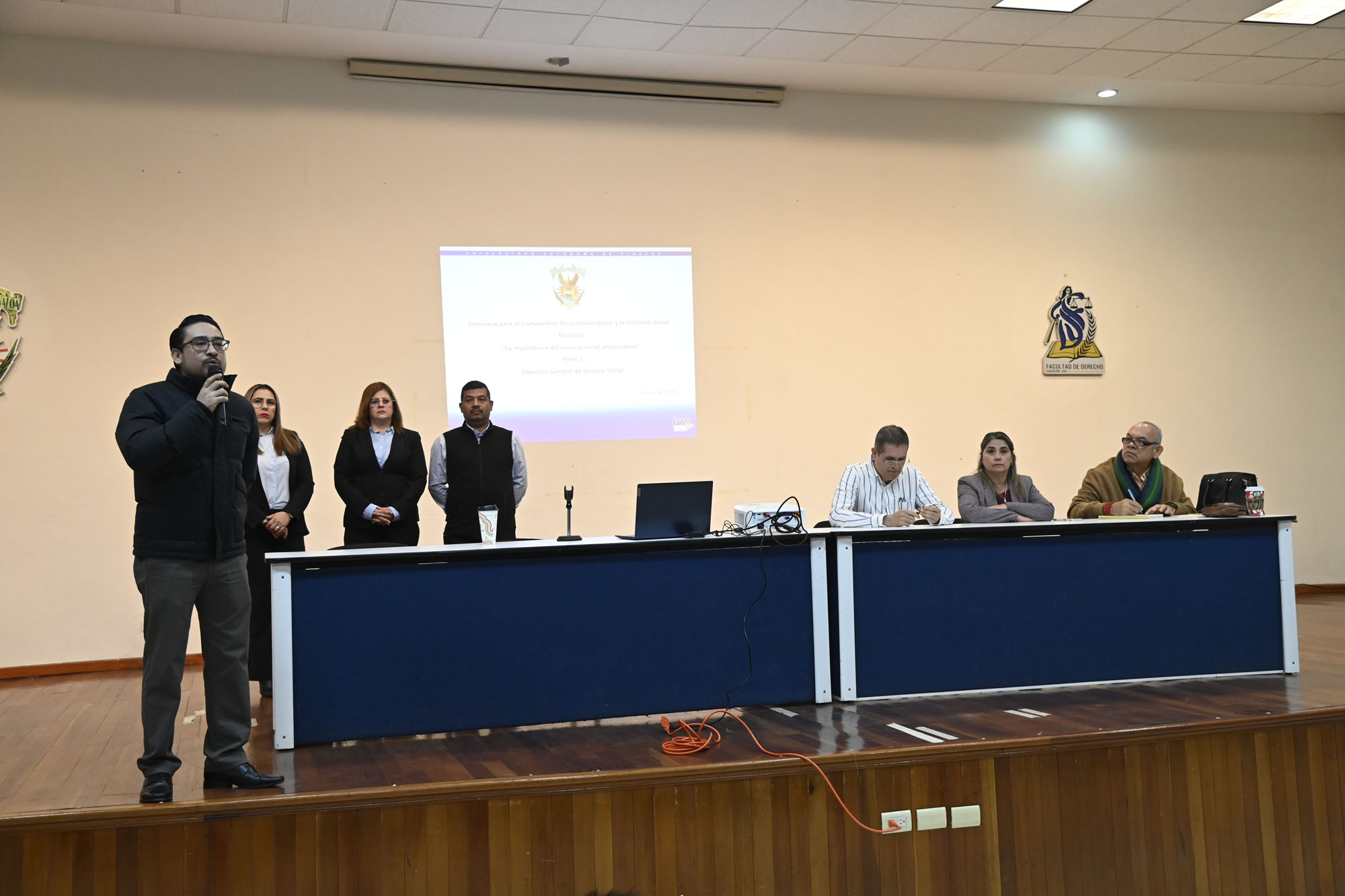 La bienvenida a los alumnos y egresados presentes en el Auditorio Diego Valadez, estuvo a cargo del maestro en ciencias Jesús Fernando Castillo Montoya, coordinador del Departamento de Servicio Social de esta unidad académica, quien mencionó que el objetivo es dar a conocer la importancia del servicio social universitario.