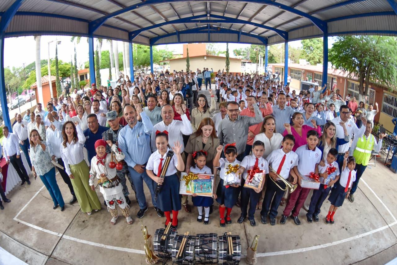 El acto incluyó la entrega simbólica de libros de texto, uniformes, útiles escolares e instrumentos para banda de guerra, en beneficio de los estudiantes. Asimismo se contó con la participación especial de la Banda de Guerra de la Secretaría de Seguridad y Protección Ciudadana de Ahome, que acompañó los honores a la bandera.