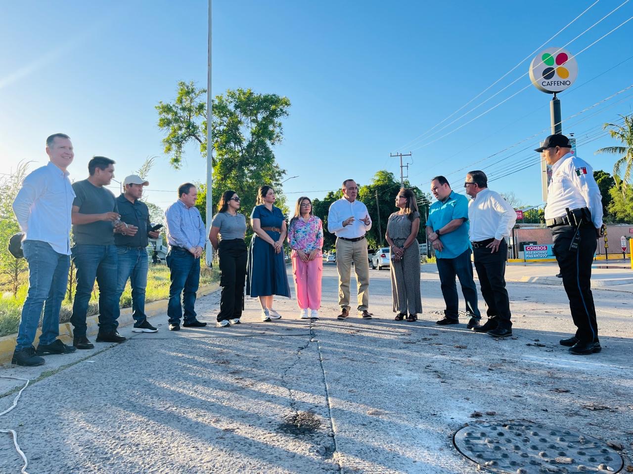 Los Mochis, Sinaloa, 14 de octubre 2025.- En punto de las cinco de la tarde, el alcalde Antonio Menendez De Llano Bermúdez, se dio cita por segundo día consecutivo en el nuevo socavón que se descubrió en Boulevard Centenario y calle Niños Héroes, acompañado de los Regidores, titulares de Obras Públicas, Japama, COMUN, Tesoreria, Tránsito Municipal y Seguridad Pública.