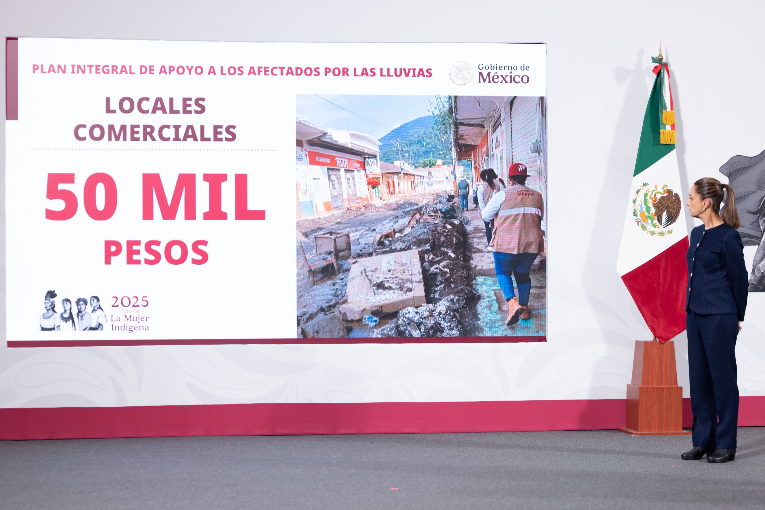 Como parte del Plan Integral de apoyo a los afectados por las lluvias, también se entregará un Vale de Enseres para refrigerador, estufa, colchón, vajilla y ventilador, así como un Vale de Canasta Alimentaria. Asimismo, se brindará apoyo para la reconstrucción de vivienda, esto de acuerdo con el nivel de afectación, si los daños son medios será de 25 mil pesos, en caso de ser afectaciones mayores será de 40 mil pesos y en pérdidas totales será de 70 mil pesos, además, la Secretaría de Desarrollo Agrario, Territorial y Urbano (Sedatu) reubicará las viviendas ubicadas en zonas de riesgo. También se darán 50 mil pesos a los locales comerciales.