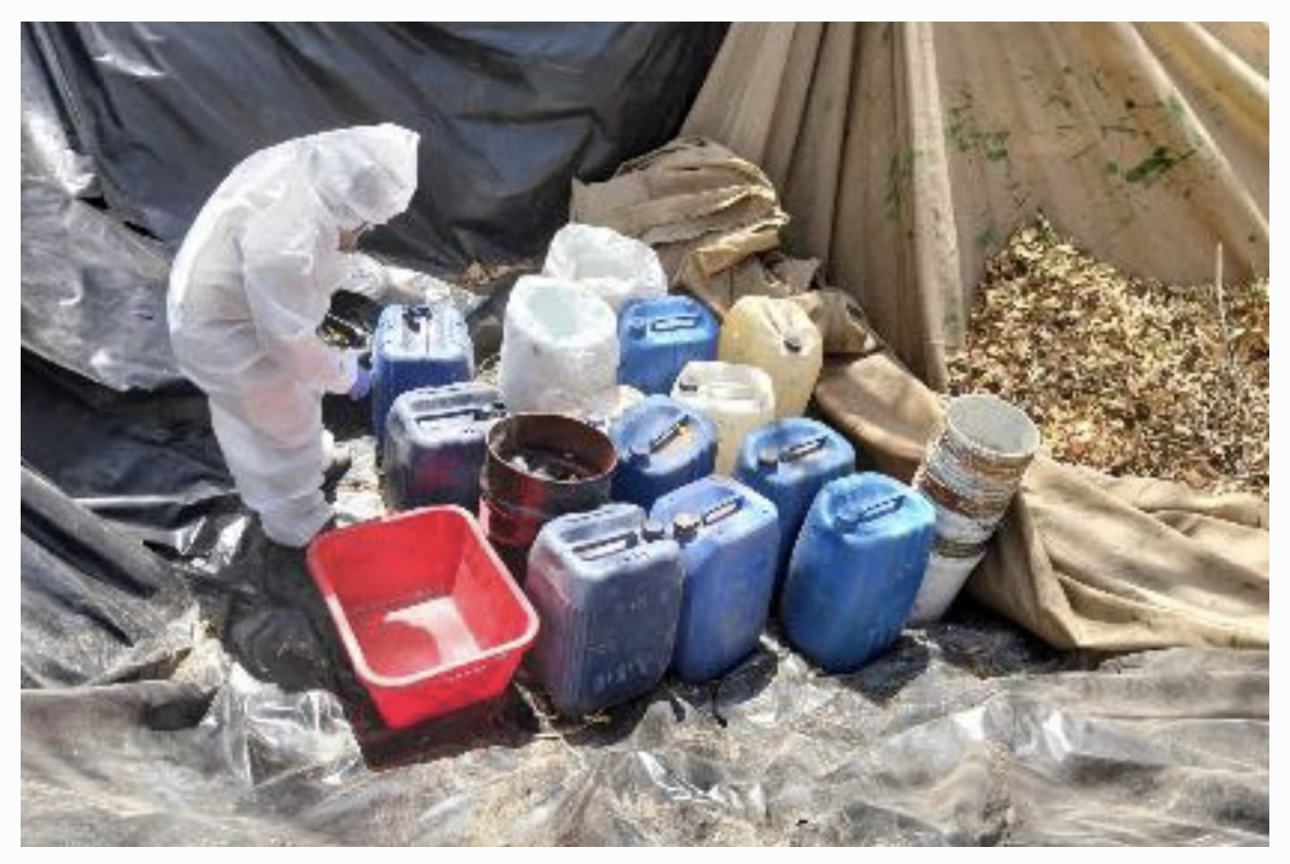 A través de trabajos de reconocimiento terrestre en dichos municipios, el personal militar localizó asentamientos utilizados para la fabricación de drogas sintéticas, con diversas sustancias químicas, además de reactores, bidones, tambos y mallas.