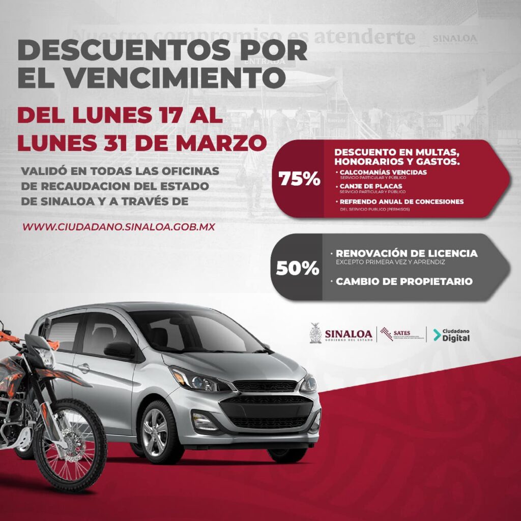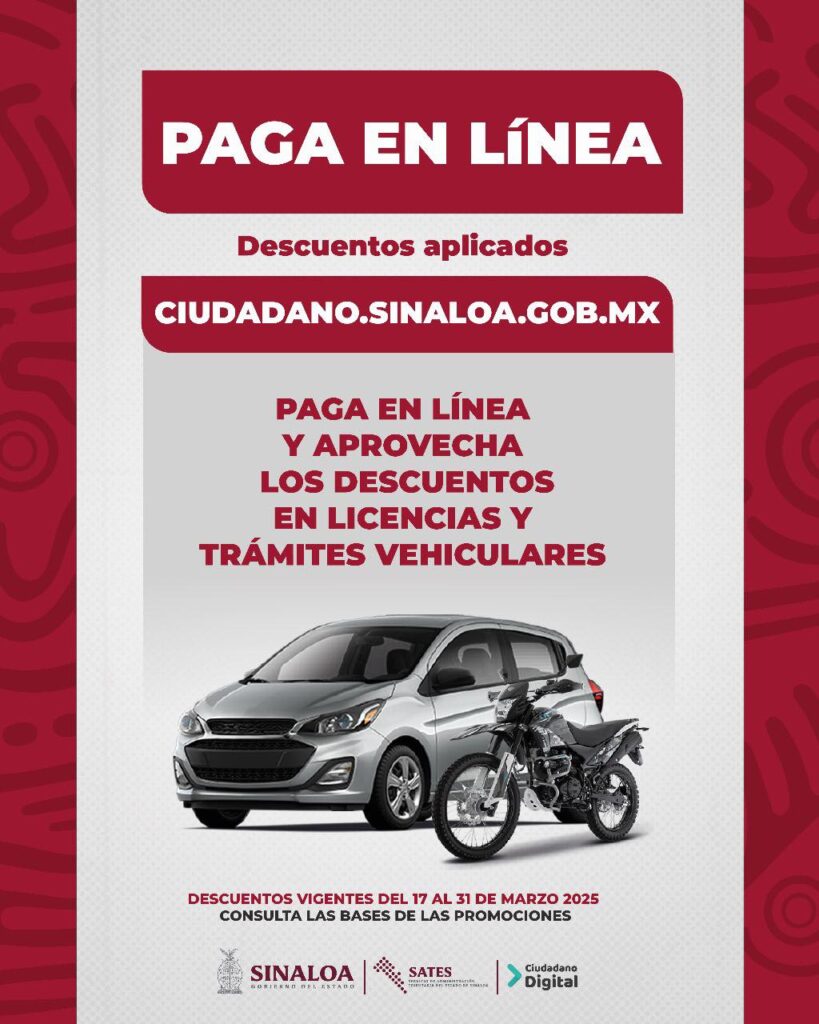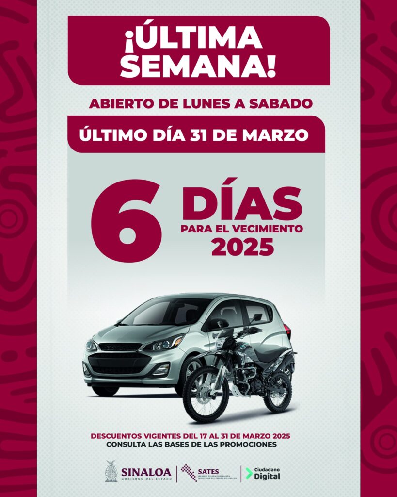 Culiacán, Sinaloa.- A tan solo seis días del vencimiento del trámite vehicular 2025, las autoridades estatales recuerdan a los propietarios de motocicletas y automóviles que el plazo final es el próximo 31 de marzo.