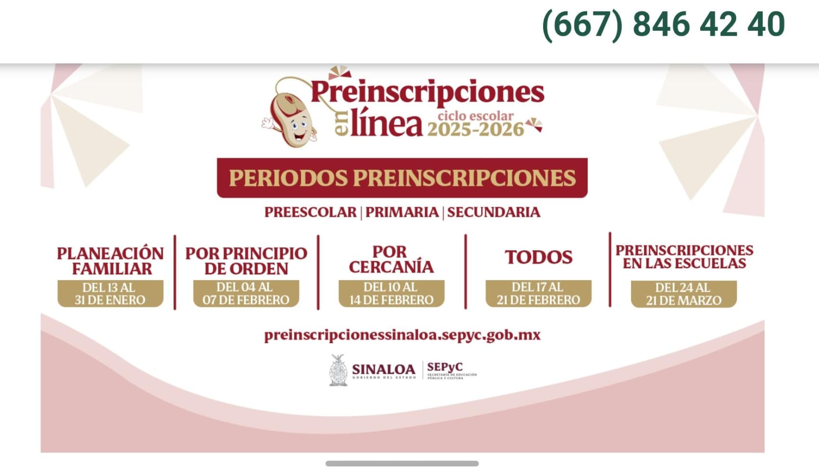 “Arrancamos ya la planeación familiar del 13 al 31 de enero, la primera etapa que es del 13 al 31 de enero donde los padres de familia pues hacen esta planeación para que sea más fácil en el periodo de inscribir a sus hijos con un solo click acceder al plantel que más se les acomode después iniciamos ya de lleno con la preinscripción, que es de 04 al 13 de febrero se inicia con el periodo de inscripción de hermanos, hijos de trabajadores,alumnos con alguna discapacidad o autismo que van a tener oportunidad esta semana de hacer el registro luego continuamos del 10 al 14 de febrero para los que viven en escuelas cercanas al domicilio, del 17 al 21 de febrero que ya es para el público en general, finalmente del 24 de febrero al 21 de marzo ya se hace el registro en las escuelas, porque en la zona rural escuelas que no se pueden acceder por medio de preinscripciones en lna entonces el padre de familia pues tiene que ir directamente a los planteles”