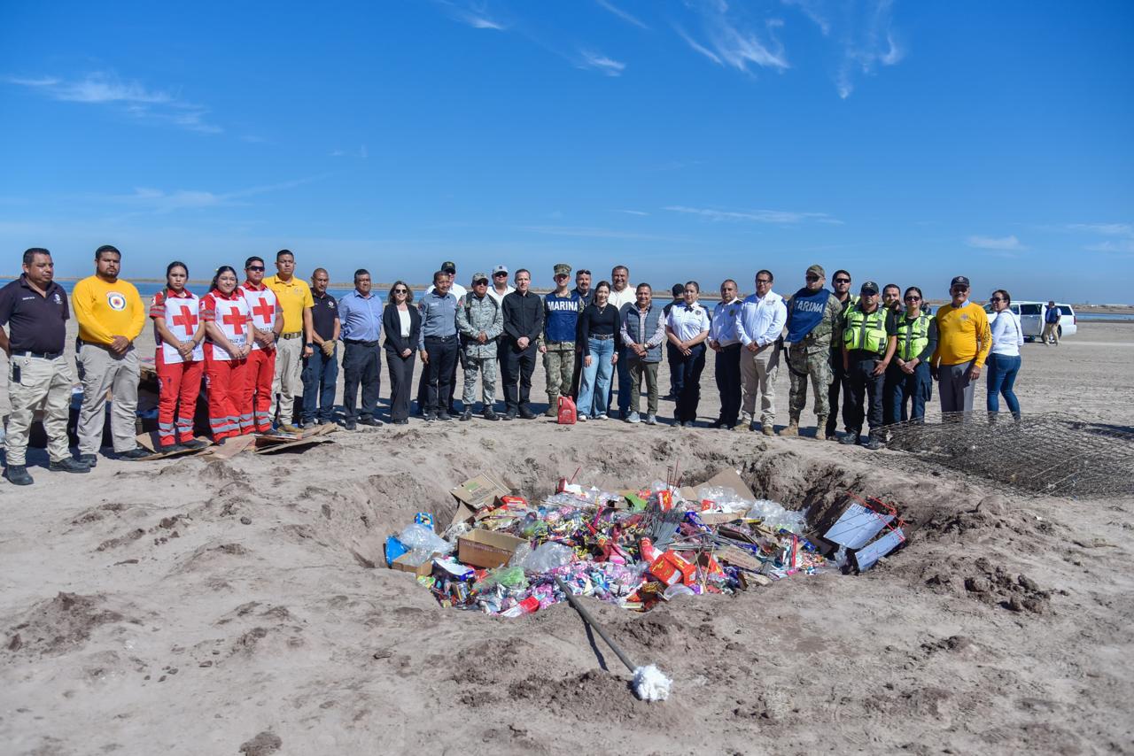 Los Mochis, Ahome, Sinaloa, a 26 de Febrero del 2025.- Como parte de los operativos de seguridad y prevención en el municipio de Ahome, autoridades de los tres niveles de Gobierno llevaron a cabo la destrucción de 444 kilogramos de pirotecnia decomisada durante el año 2024. La incineración de este material explosivo se realizó en coordinación con Protección Civil Estatal y Municipal, donde también se contó con la presencia de la Guardia Nacional, DEFENSA, Marina, elementos de la Secretaría de Seguridad y Protección Ciudadana del Municipio de Ahome, socorristas y bomberos.