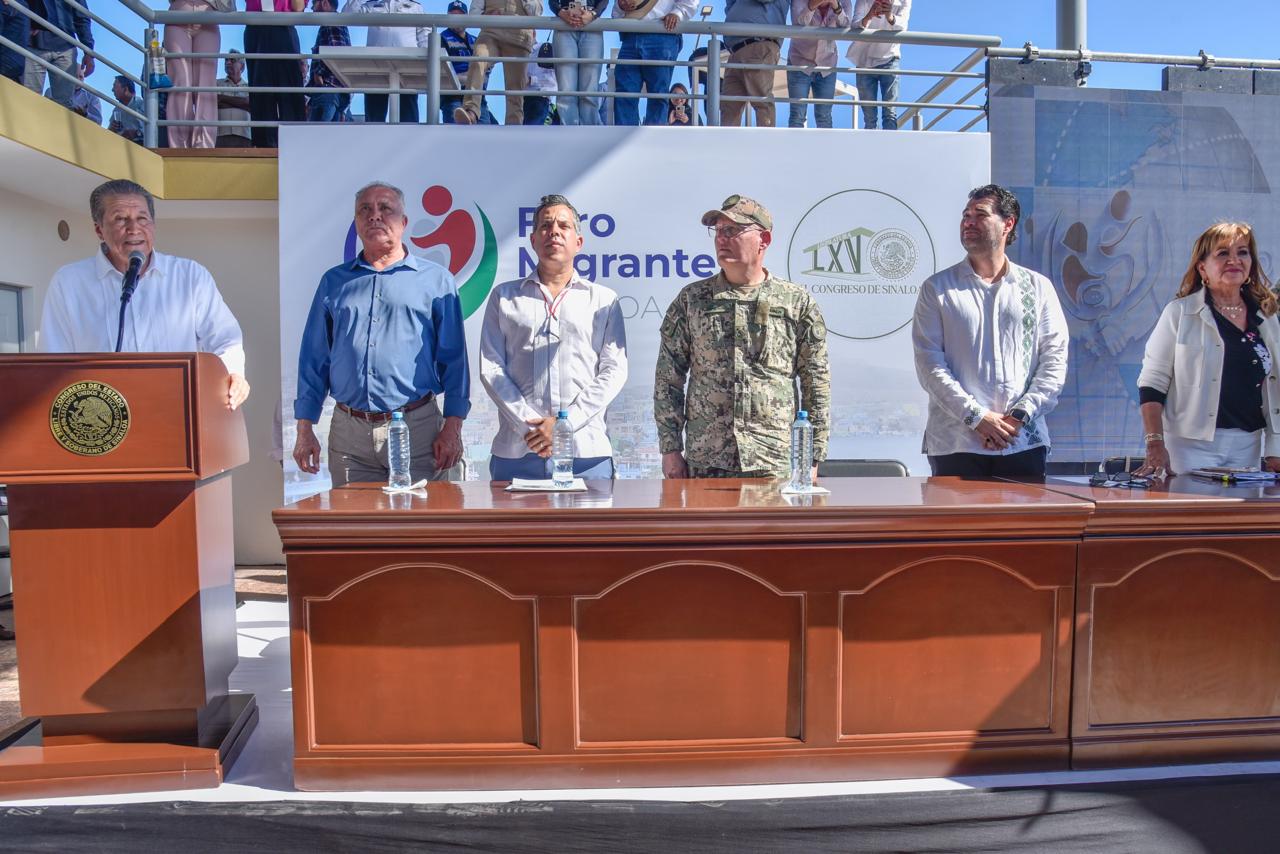 El presídium estuvo conformado por Feliciano Castro Meléndrez, Secretario General de Gobierno en Sinaloa, quien acudió en representación del Gobernador del Estado, doctor Rubén Rocha Moya; la diputada María Teresa Guerra Ochoa, Presidenta de la Junta de Coordinación Política; diputado César Ismael Guerrero Alarcón, Presidente de la Comisión de Asuntos Migratorios; Juan Garibaldi Hernández, Secretario del Ayuntamiento, en representación del Presidente Municipal de Ahome, Gerardo Vargas Landeros; los presidentes municipales de El Fuerte y Juan José Ríos, Gildardo Leyva Ortega y Evangelina Llanes Carrión, respectivamente; el Coronel de Infantería Édgar Soto Lizárraga, Comandante del 89 Batallón de Infantería; y el Vicealmirante Leopoldo Jesús Díaz González, Comandante de la 8va. Zona Naval.