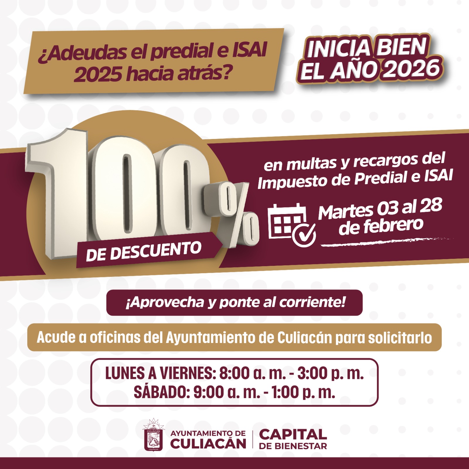 Culiacán, Sinaloa; a 6 de febrero de 2026.- Con el objetivo de apoyar la economía de las familias y fortalecer la recaudación municipal, el Ayuntamiento de Culiacán puso en marcha la promoción “Inicia Bien el Año 2026”, que contempla un 100 por ciento de descuento en multas y recargos del Impuesto Predial e ISAI, aplicable a adeudos de 2025 y años anteriores.