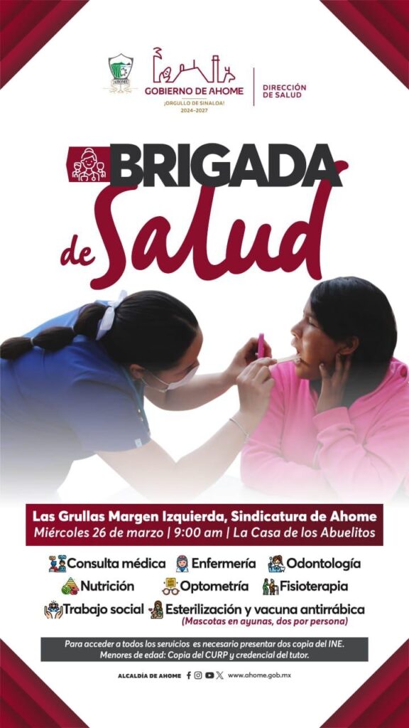 Los Mochis, Sinaloa – El Gobierno de Ahome, a través de la Dirección de Salud, anunció la realización de una Brigada de Salud en la comunidad de Las Grullas Margen Izquierda, Sindicatura de Ahome, con el objetivo de brindar atención médica gratuita a la población.