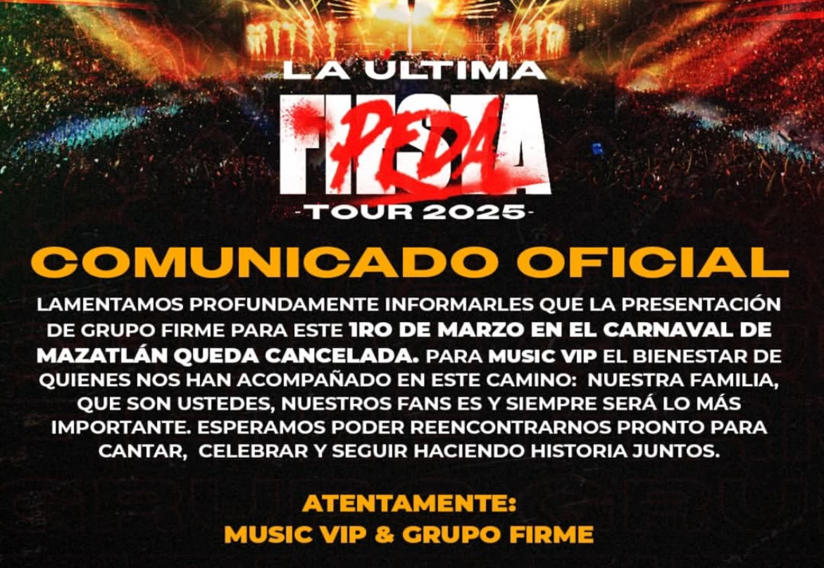 Culiacán, Sin.- Tras amenaza y horas de especulaciones, Grupo Firme, encabezado por Eduin Caz, hizo oficial la cancelación de su concierto en el Carnaval de Mazatlán, programado para el sábado 1 de marzo.