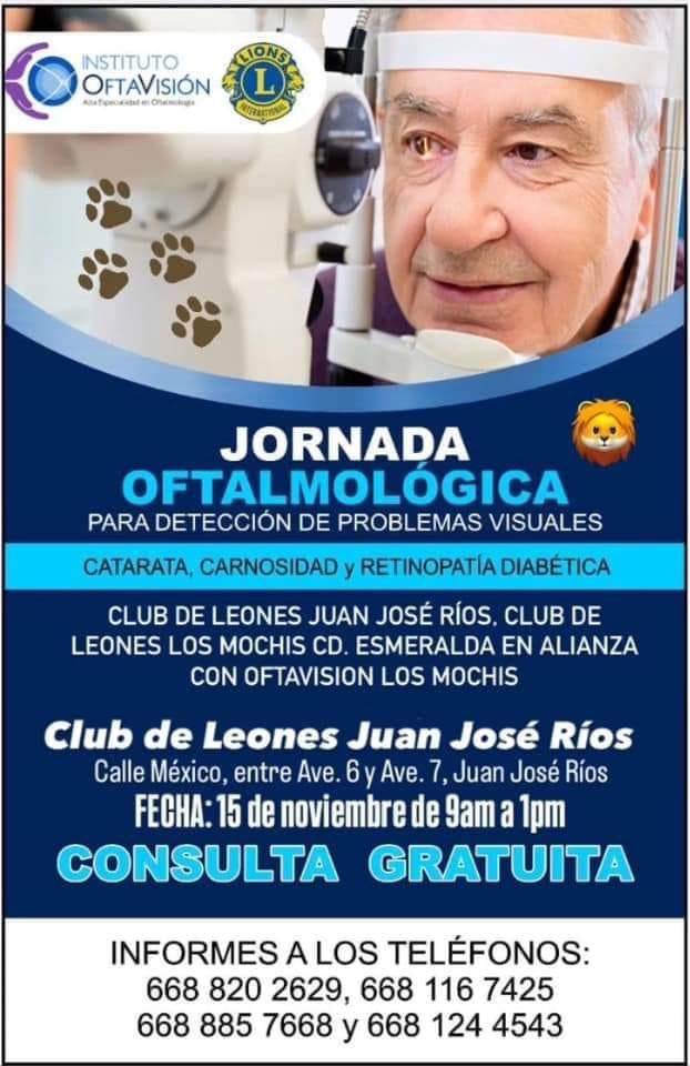 Los Mochis, Sin.- Integrantes del Club de Leones invitaron a todos los ahomenses y Cherricenses (Juan José Ríos), a sus dos Jornadas Oftalmológicas, las cuales se llevarán a cabo los días 15 y 22 de noviembre.