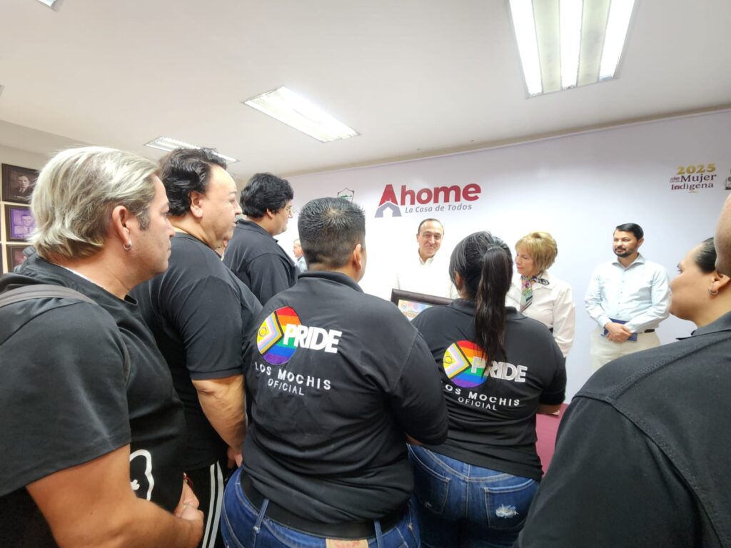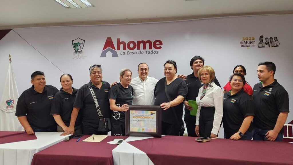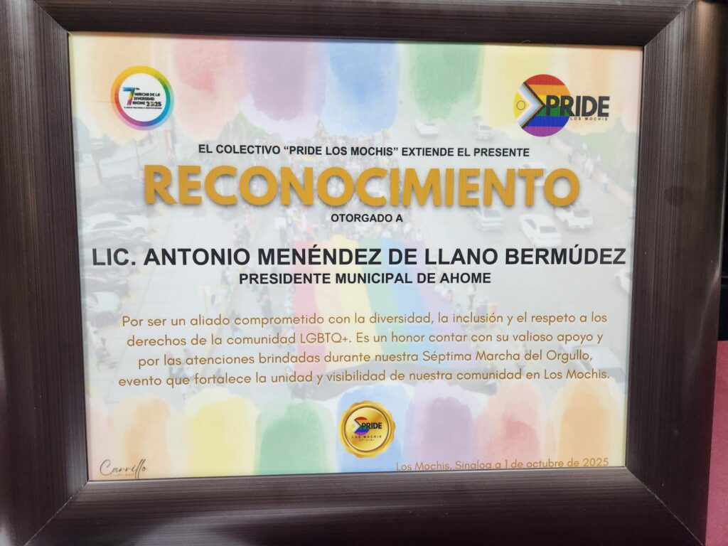 Los Mochis, Sinaloa.– Integrantes de la comunidad LGBTQ+ acudieron este miércoles 1 de octubre al Salón de Cabildo de Ahome para entregar un reconocimiento al presidente municipal Antonio Menéndez de Llano Bermúdez, en agradecimiento al respaldo brindado para la realización de la marcha del orgullo 2025.