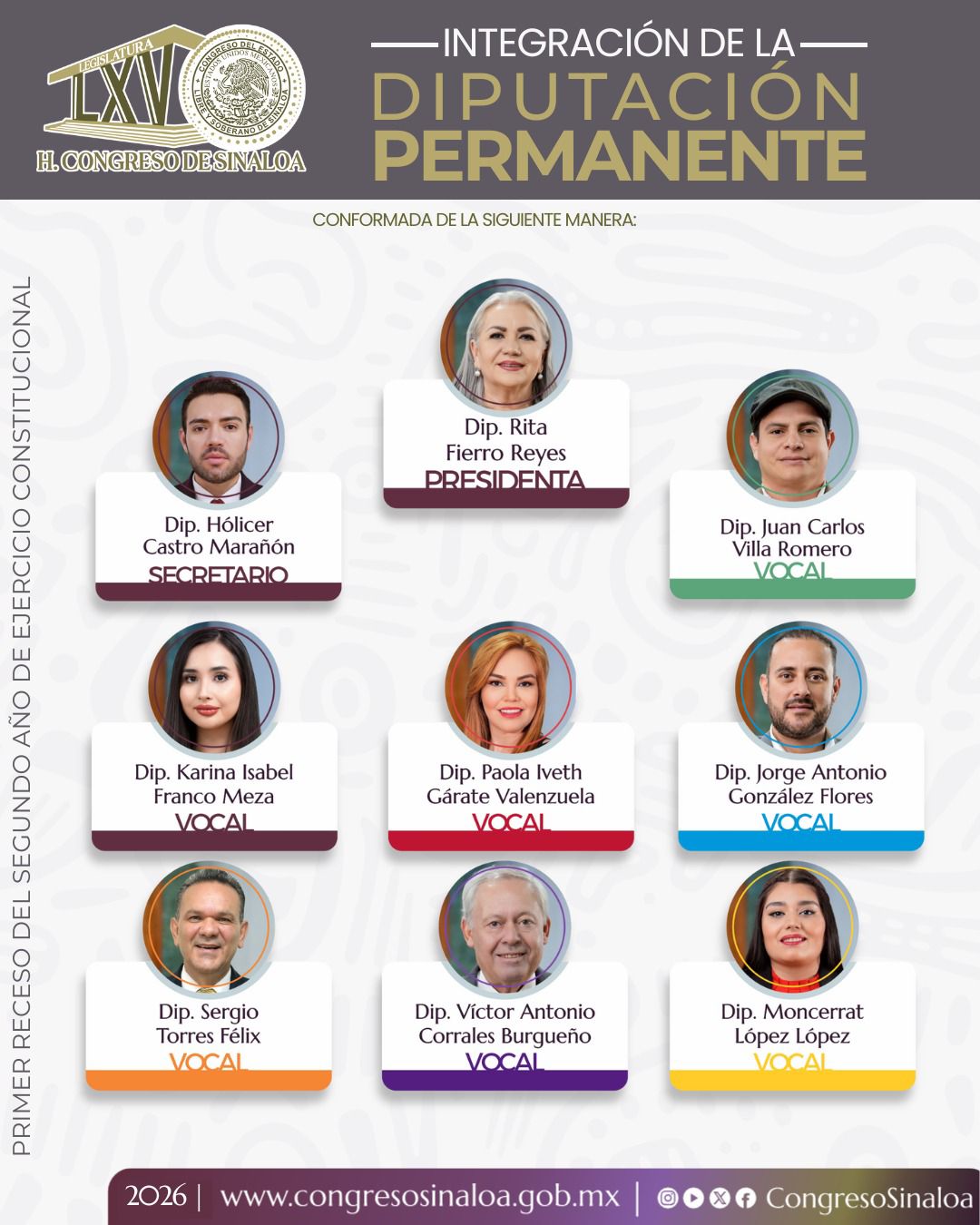 La Diputación Permanente quedó integrada por la diputada Rita Fierro Reyes como presidenta y Nancy Yadira Santiago Marcos como suplente; en la secretaría fue designado el diputado Hólincer Castro Marañón y Kristiam Alexis Espinoza García como suplente. Como vocales fueron electos el diputado Juan Carlos Villa Romero, las diputada Karina Isabel Franco Meza, Paola Iveth Gárate Valenzuela y Moncerrat López López; los diputados Jorge Antonio González Flores, Sergio Torres Félix y Víctor Antonio Corrales Burgueño.