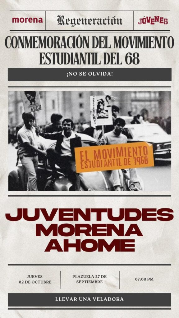 Los Mochis, Sin.- En honor a todos los estudiantes, Juventudes Morena del municipio de Ahome, Sinaloa, del Partido Morena, convoca la Conmemoración del Movimiento Estudiantil del 68.