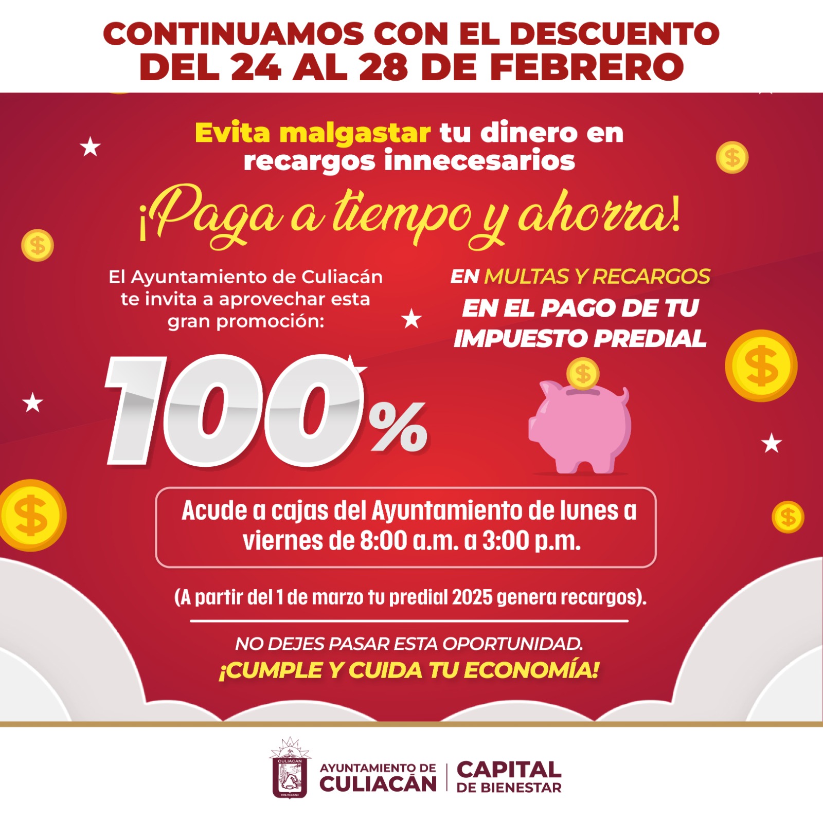 Culiacán, Sin., a 22 de febrero de 2025.- El Ayuntamiento de Culiacán mantiene vigente la promoción especial para el pago del impuesto predial, ofreciendo un 100% de descuento en multas y recargos hasta el próximo 28 de febrero.
