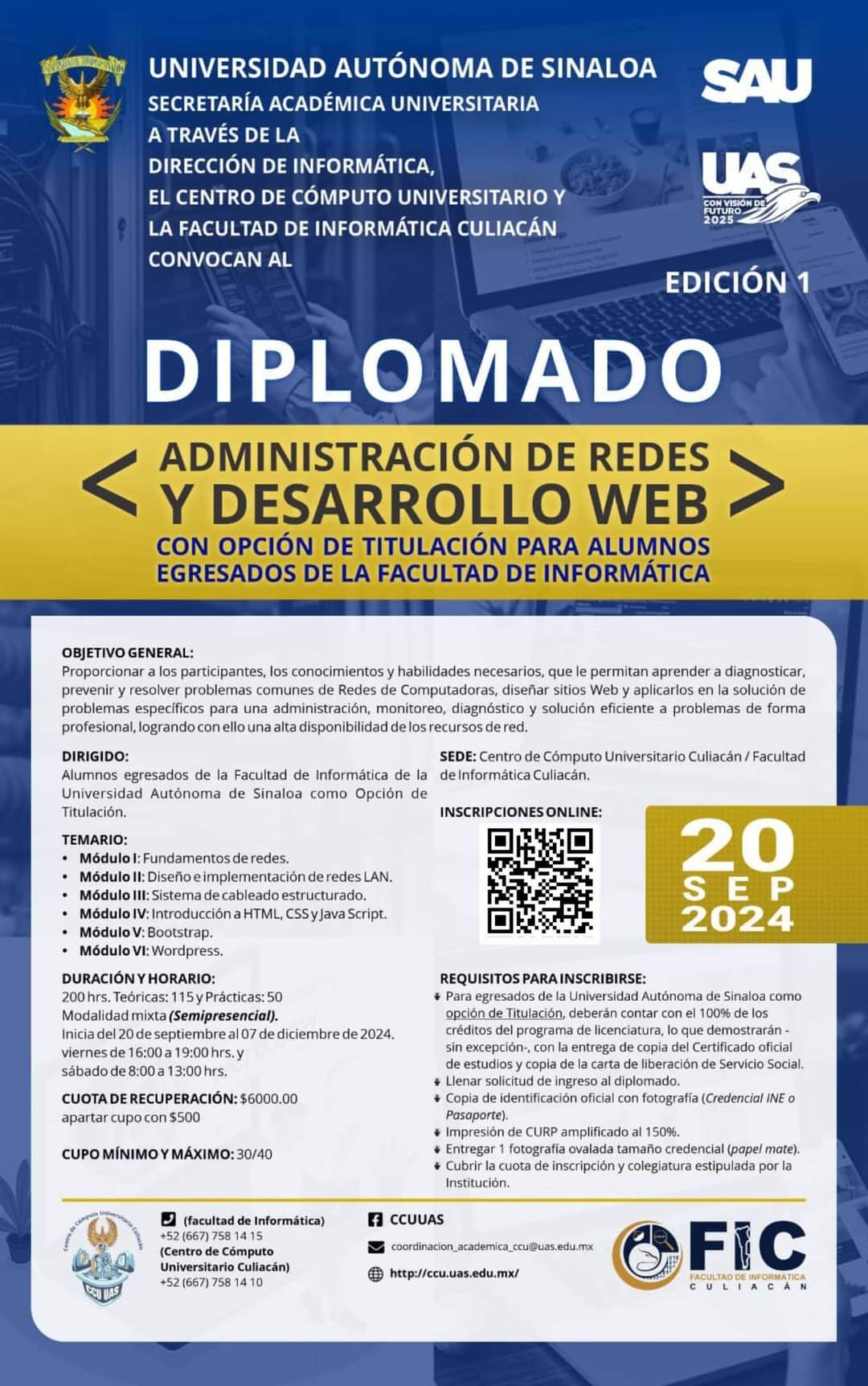 Gracias a los esfuerzos coordinados entre la Secretaría Académica Universitaria, la Dirección de Informática, el Centro de Cómputo Universitario y la Facultad de Informática Culiacán de la Universidad Autónoma de Sinaloa (UAS), fue posible el inicio de la primera edición del Diplomado “Administración de Redes y Desarrollo Web”, el cual tiene la opción de titulación y es orientado a los alumnos egresados de la Unidad Académica de Informática.