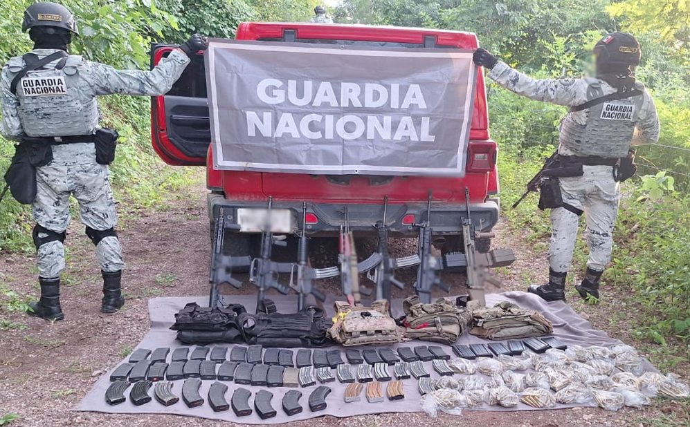 -En Culiacán, en el poblado Los Mayos, elementos de GN localizaron un vehículo, aseguraron siete armas largas, 63 cargadores, 1,744 cartuchos, cinco chalecos tácticos y 10 placas balísticas.