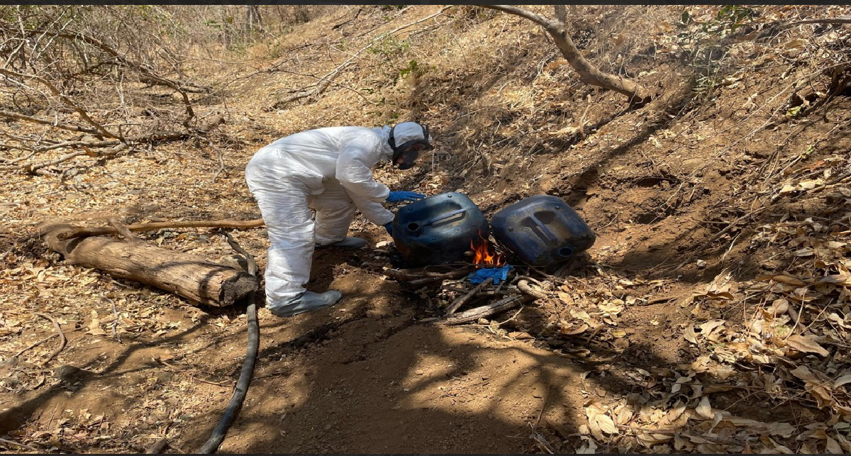 En Elota, se localizó e inhabilitó un área de concentración de material diverso para la elaboración de metanfetamina, se aseguraron 250 litros de sustancias químicas para la elaboración de la droga. La afectación económica a las organizaciones delictivas es de 5 millones de pesos.