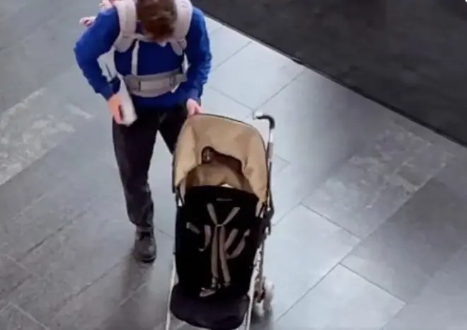 El hombre nota que la carriola está vacía, la mueve de un lado a otro y busca, aparentemente, a su bebé, sin éxito.