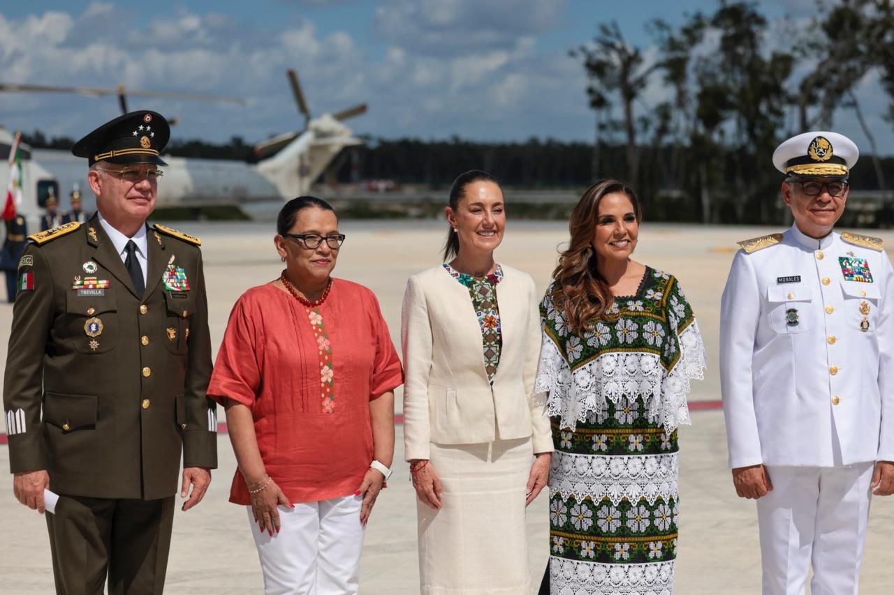 Acompañaron a la Presidenta, la secretaria de Gobernación, Rosa Icela Rodríguez Velázquez; el secretario de la Defensa Nacional y Alto Mando del Ejército, Fuerza Aérea y Guardia Nacional, general Ricardo Trevilla Trejo; el secretario de Marina y Alto Mando de la Armada de México, almirante Raymundo Pedro Morales Ángeles; la gobernadora de Quintana Roo, Mara Lezama Espinosa.