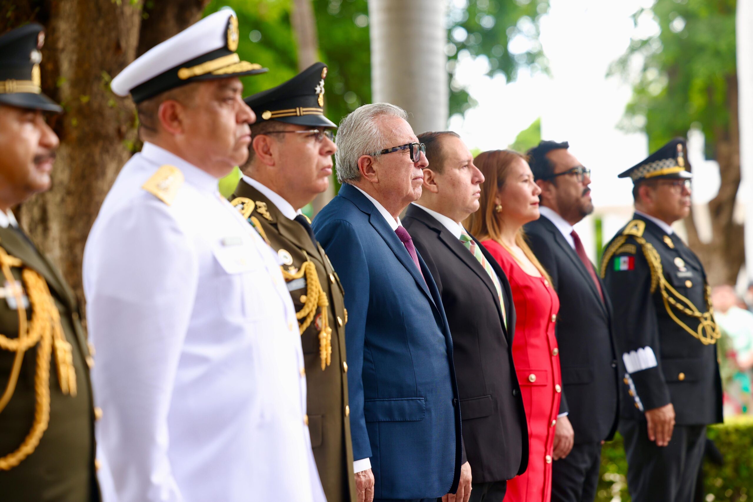 Culiacán Sinaloa a 16 de septiembre de 2025. – Este martes el gobernador Rubén Rocha Moya encabezó la ceremonia por el 215 aniversario del inicio de la guerra de independencia siendo acompañado por autoridades de los tres órdenes de gobierno, la presidenta de la Comisión de Seguridad del Congreso del Estado, Arely Berenice Ruiz; el presidente del Poder Judicial, magistrado Jesús Iván Chávez Rangel, el Comandante de la Tercera Región Militar, General Guillermo Briseño Lobera, el Comandante de la Cuarta Zona Naval, Vicealmirante José Manuel Reséndiz Sandoval, el alcalde de Culiacán, Juan de Dios Gámez Mendívil, el Comandante de la Novena Zona Militar, General Santos Gerardo Soto y el comandante de la Guardia Nacional en Sinaloa, General Francisco Alvarado Terán.