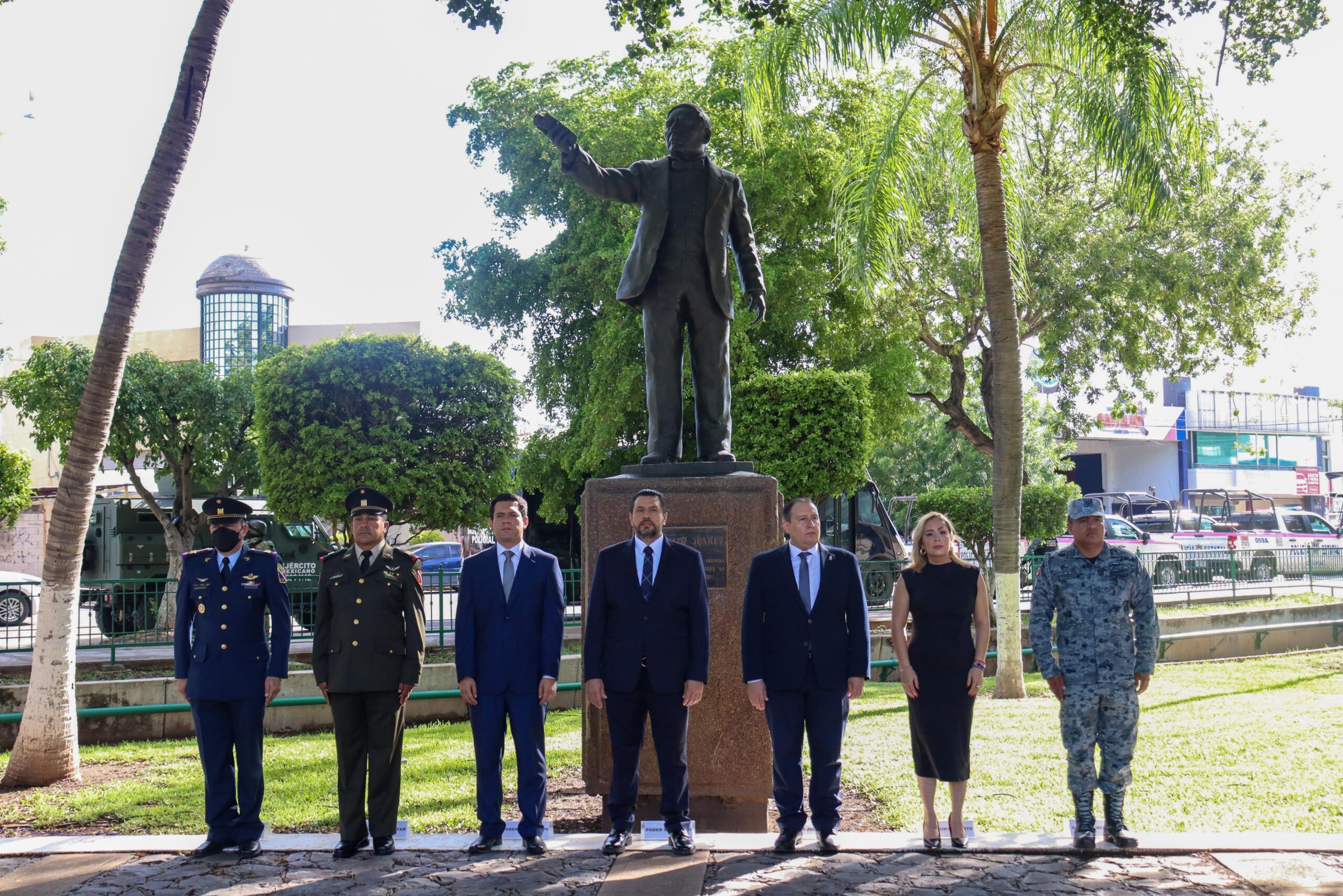 Después del izamiento del lábaro patrio, Bello Esquivel, con la representación del Gobernador Rubén Rocha Moya y acompañado de las autoridades civiles y militares escucharon una remembranza del Benemérito de las Américas, en donde se destacó la máxima que acuñó y que hoy en día se mantiene vigente: “Entre los individuos como entre las naciones, el respeto al derecho ajeno es la paz”.