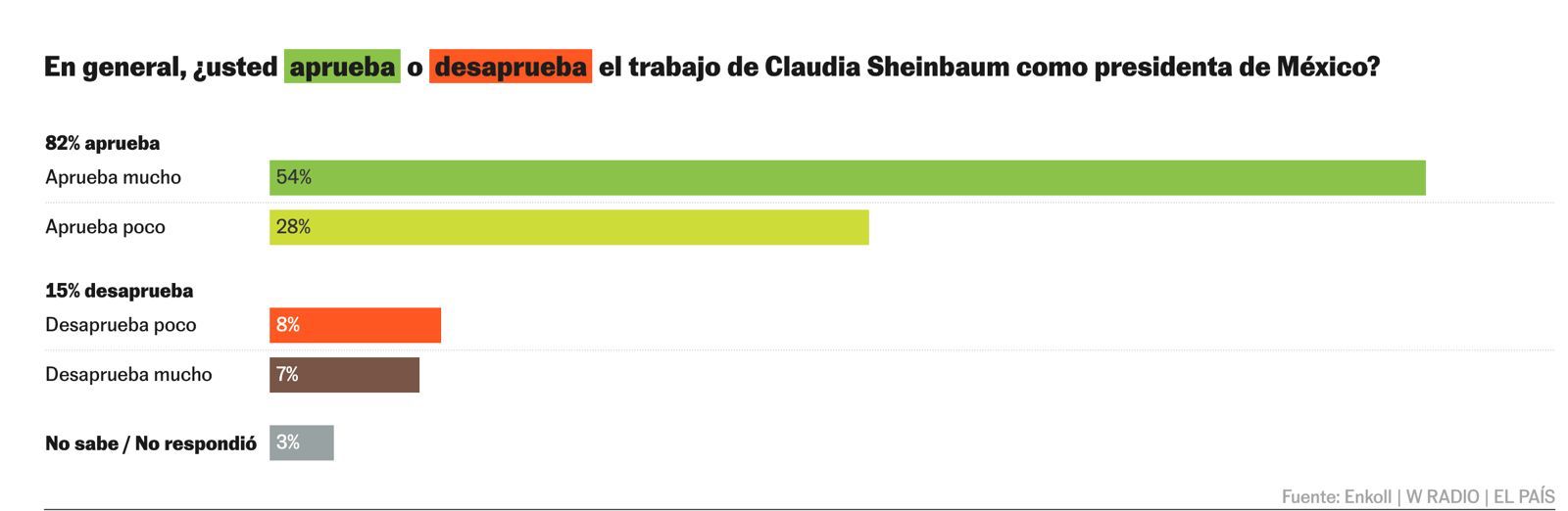 El PAIS. El regreso de Trump a la Casa Blanca está siendo un terremoto que cada poco hace temblar el tablero internacional. El magnate tiene a México entre sus objetivos preferidos, le acusa de ser la puerta trasera de las importaciones chinas, de no contener la migración que cruza por el río Bravo y de inundar sus calles de fentanilo, el potente opioide que ha provocado una epidemia mortal en EE UU, engordando cada vez más el ogro del crimen organizado. Como castigo -y estrategia de negociación- está golpeando a México, entre otros países, con políticas proteccionistas encarnadas en la imposición de duros aranceles si no se hace lo pide. La presidenta Claudia Sheinbaum ha conseguido, por ahora, esquivar algunos, pero no todos. La mandataria está mostrando un nervio templado para negociar, conjugando mensajes de firmeza ante los ataques del magnate, *con acciones concretas destinadas a desinflar la tensión y hasta guiños de estar dispuesta a colaborar. Una estrategia que está reforzando su imagen dentro del país. *Un 82% de los mexicanos aprueba su gestión de acuerdo con una encuesta realizada por Enkoll para EL PAÍS y W Radio.