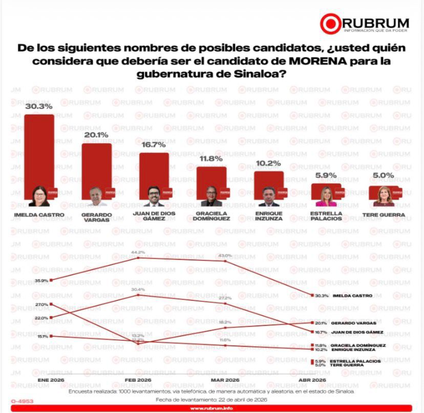 Un estudio demoscópico realizado por la casa encuestadora RUBRUM en la segunda quincena de abril de 2026, reveló que la senadora Imelda Castro encabeza las preferencias internas de Morena rumbo a la elección por la gubernatura de Sinaloa que se definirá en el 2027.