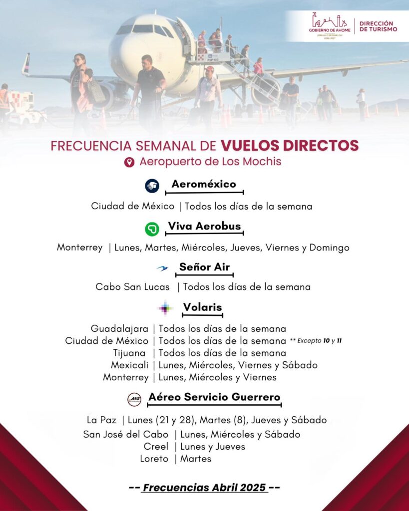 Los Mochis, Sinaloa.- Con el objetivo de fortalecer la conectividad aérea de la región, el Aeropuerto de Los Mochis ha dado a conocer la frecuencia semanal de vuelos directos disponibles para abril de 2025, operados por diversas aerolíneas nacionales.