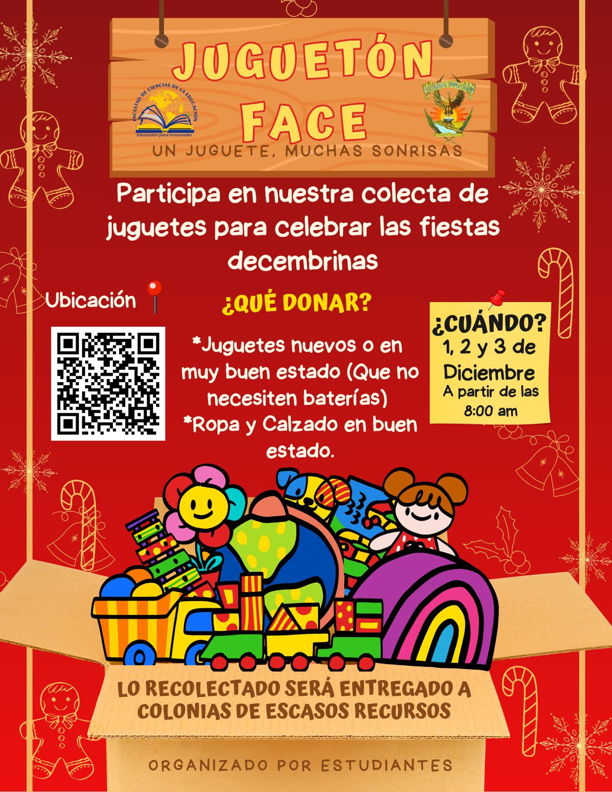 Estudiantes de la Facultad de Ciencias de la Educación (FACE) de la Universidad Autónoma de Sinaloa (UAS), invitan a compañeros alumnos, docentes y personal administrativo del Campus Dr. Carlos Alfredo Zambada Sentíes a participar en el Juguetón FACE “Un juguete, muchas sonrisas”, del 1 al 3 de diciembre a partir de las 8 de la mañana.