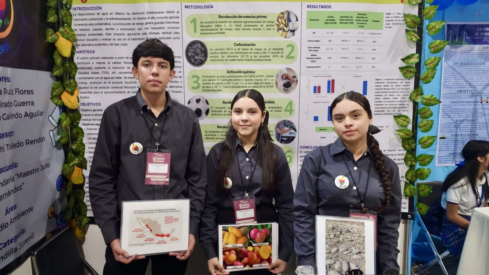 Derek Galindo Aguilar, Andrea Ruíz y Alejandra Tirado representaron al Estado, con el apoyo de la Universidad Autónoma de Sinaloa, en la Expociencias Nacional 2025, que tuvo sede en Tampico, Tamaulipas, con un proyecto que consistió en el aprovechamiento del hueso de mango convertido en carbón activado para uso doméstico.