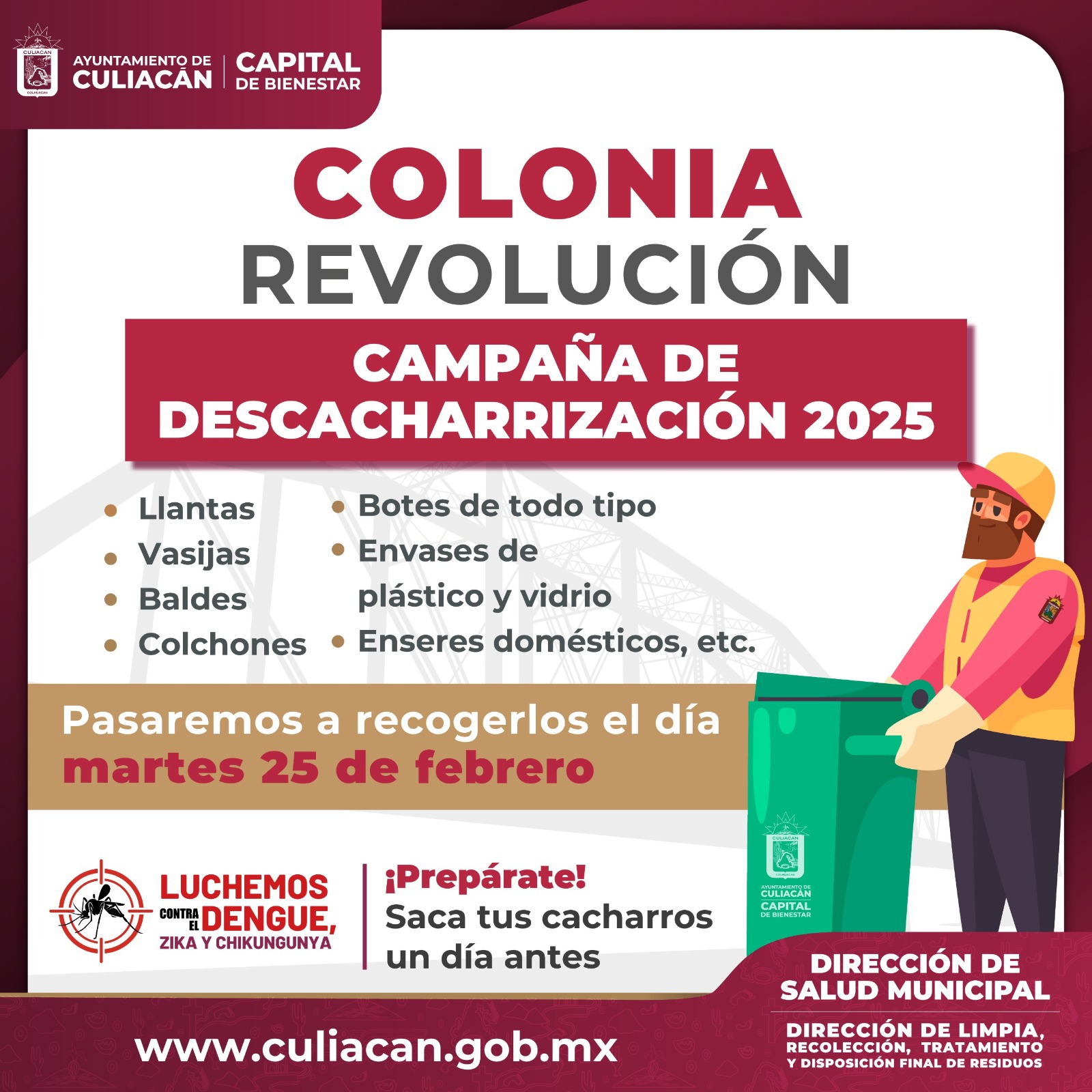 El próximo destino será la colonia Revolución, donde la jornada de descacharrización se llevará a cabo el martes 25 de febrero. Se invita a los residentes de esta colonia a sacar sus cacharros un día antes para facilitar su recolección y correcta disposición.