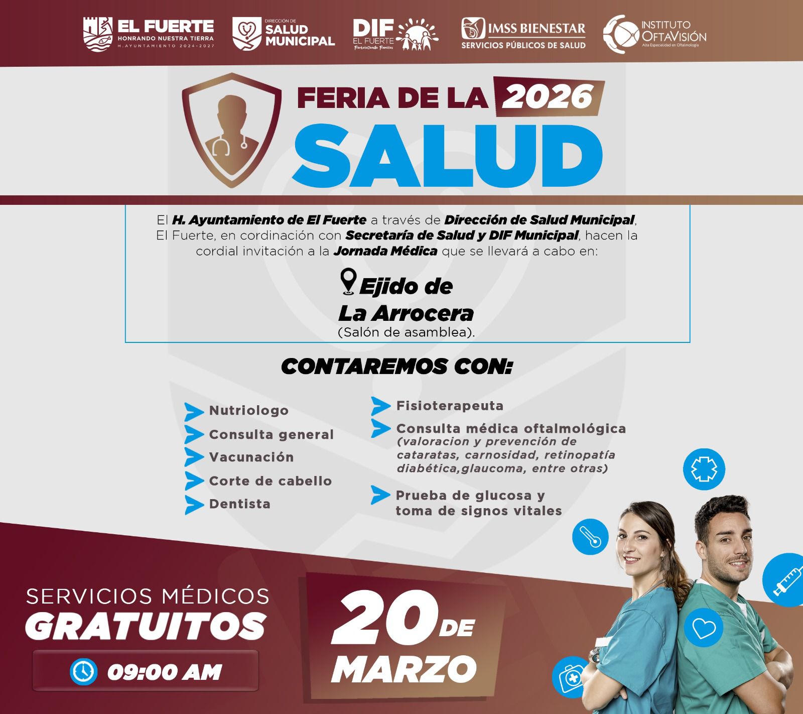 El H. Ayuntamiento de El Fuerte, en coordinación con Salud Municipal, DIF El Fuerte, IMSS Bienestar y el Instituto Oftavisión, llevará a cabo una Feria de la Salud en el Ejido La Arrocera, con el objetivo de acercar servicios médicos gratuitos a la población.