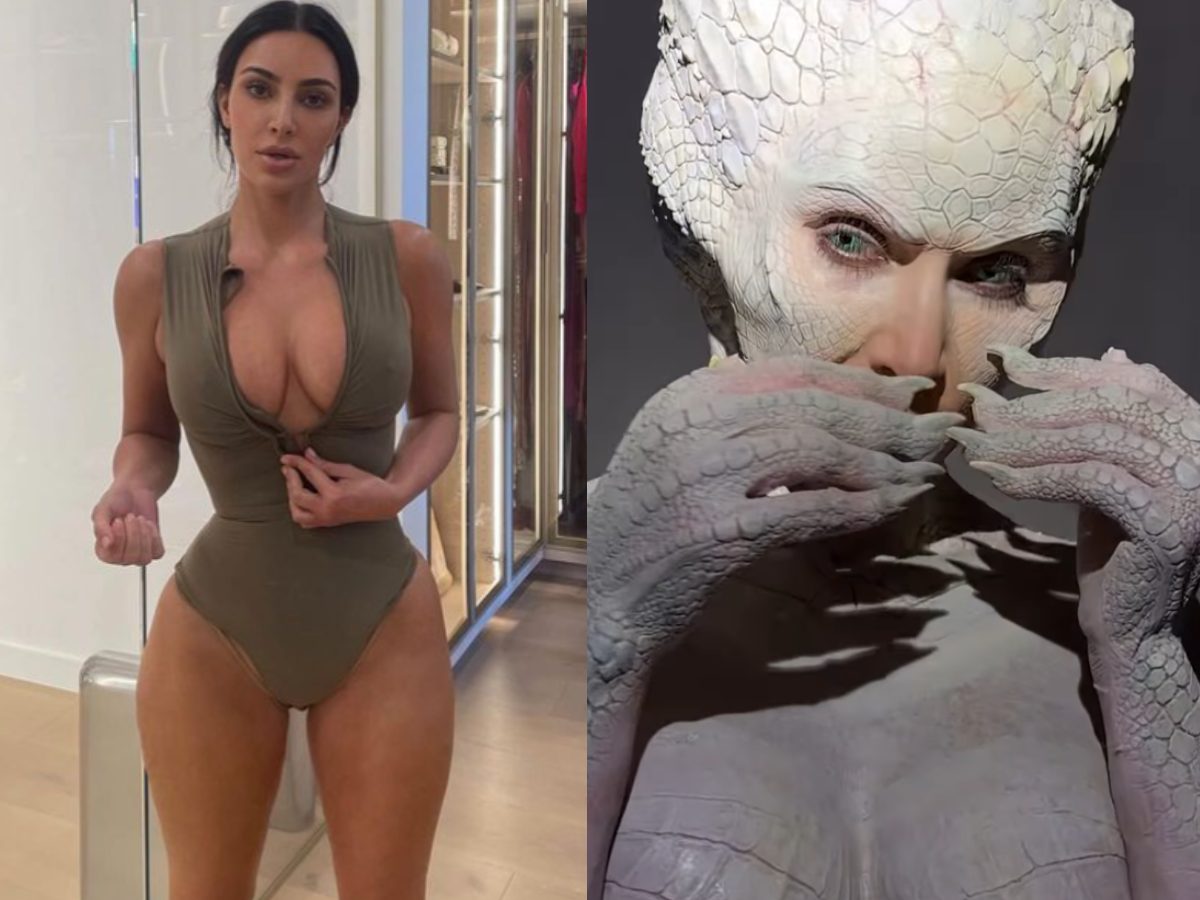 A través de su cuenta de Instagram, Kim Kardashian compartió un vistazo detrás de cámaras del proceso de creación y colocación de su disfraz de caimán albino. Las fotos y videos mostraron a la empresaria completamente desnuda, con solo algunas piezas de látex estratégicamente colocadas en zonas íntimas y en su cabeza.