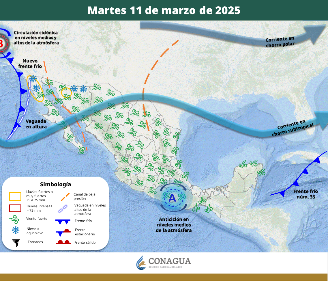 También habrá chubascos y lluvias puntuales fuertes en Baja California, Sonora y Chihuahua, así como probabilidad de caída de nieve o aguanieve en las sierras de dichas entidades; además de vientos muy fuertes a intensos con tolvaneras en el noroeste, norte y noreste del país.