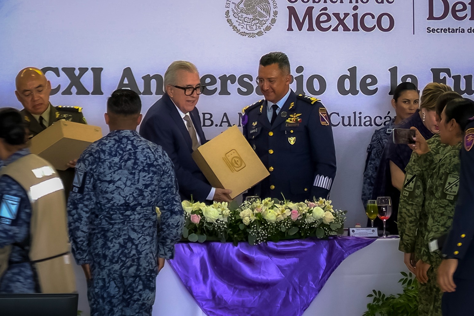 También asistieron a esta ceremonia de aniversario de la FAM, el comandante de la Novena Zona Militar, general de Brigada, Santos Gerardo Soto; el presidente de la Mesa Directiva del Congreso del Estado, diputado Rodolfo Valenzuela Sánchez; el presidente del Supremo Tribunal de Justicia, magistrado Jesús Iván Chávez Rangel; el coordinador estatal de la Guardia Nacional en Sinaloa, general de Brigada, Julices Julián Tadeo González Calzada; la presidenta del Sistema DIF Sinaloa, Eneyda Rocha Ruiz; la secretaria general de Gobierno, Yeraldine Bonilla Valverde; el secretario de Seguridad Pública, general de Brigada, Oscar Rentería Schazarino; la fiscal general del Estado, Claudia Zulema Sánchez Kondo; el comandante de la Octava Zona Naval, vicealmirante Saúl Hirám Bandala Garza; y el general de Ala Piloto Aviador retirado, Héctor Guzmán Santacruz, comandante del Aeropuerto Internacional de Culiacán.