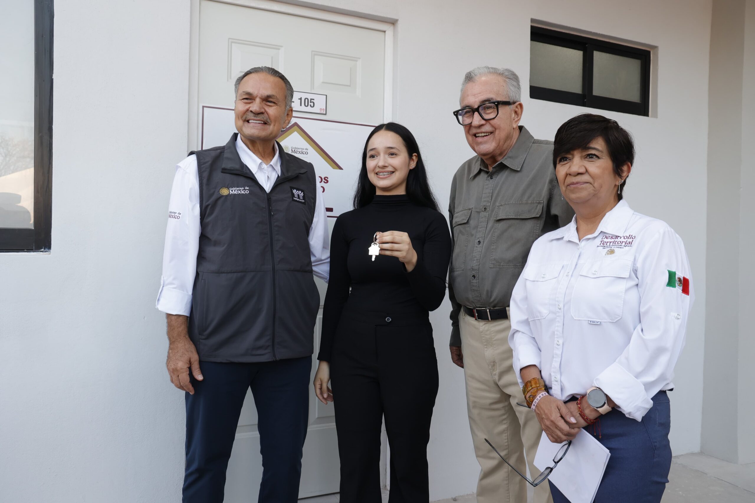Mientras tanto, Octavio Romero Oropeza, director general de INFONAVIT, entregando las llaves de su nueva vivienda a la beneficiaria Belén Fontes Zayas, informó que en el fraccionamiento Nuevo Horizonte de Los Mochis, ya fueron colocados el 100% de los 342 departamentos.