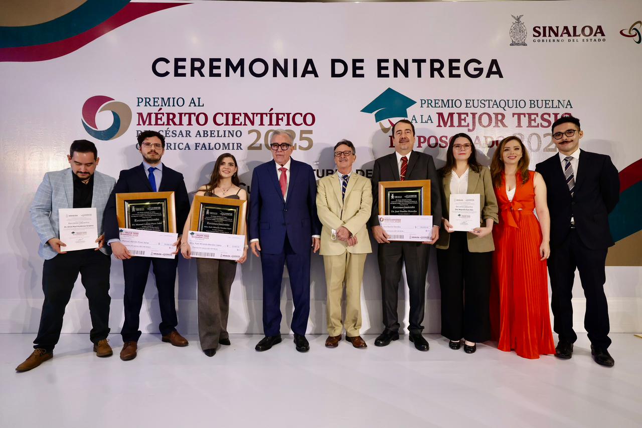 En esta ceremonia anual, el mandatario estatal también entregó otros dos galardones, que corresponden al Premio “Eustaquio Buelna” a la Mejor Tesis de Posgrado, en las modalidades de Maestría y Doctorado, correspondiendo la primera a la maestra Rubí Miranda Morales López; y la segunda, al doctor Manuel Adrián Picos Salas, reconocimientos que al igual que el Premio al Mérito Científico otorga mediante la deliberación de un jurado, la Coordinación General para el Fomento a la Investigación Científica e Innovación del Estado de Sinaloa (CONFÍE), dirigida por Carlos Karam Quiñones, quien acompañó al gobernador Rocha en la entrega de los premios.