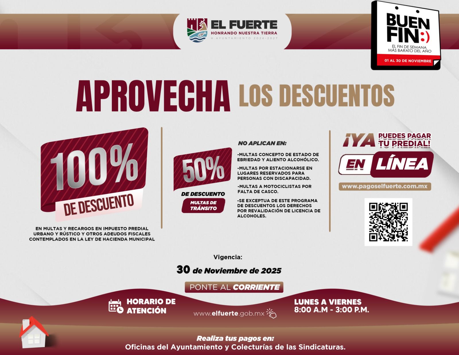 El Fuerte, Sinaloa, a 10 noviembre de 2025. – Con el objetivo de apoyar la economía familiar e incentivar la regularización de las contribuciones municipales, el H. Ayuntamiento de El Fuerte, a través de la Dirección de Ingresos, ofrece atractivos descuentos dentro del marco del Buen Fin durante todo el mes de noviembre.