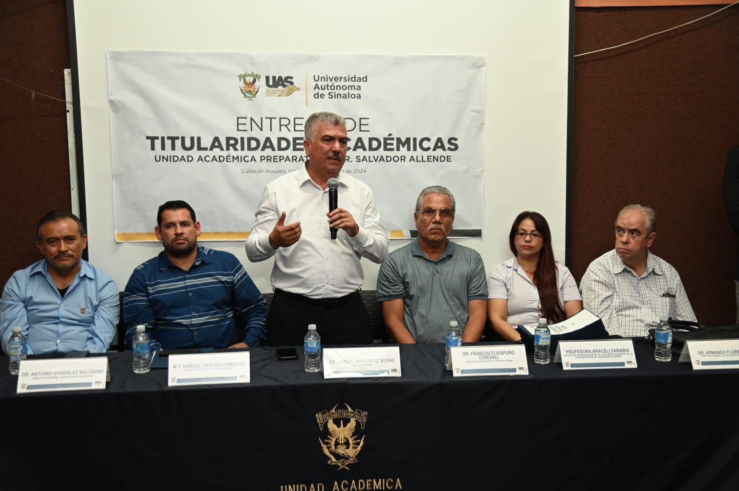 En las unidades académicas preparatorias Augusto César Sandino y Salvador Allende, la Universidad Autónoma de Sinaloa (UAS), entregó un total de 165 titularidades académicas que le brindan certeza laboral a igual número de docentes, cumpliendo así con el compromiso de no afectar la carga laboral de los maestros al implementarse el Nuevo Modelo Educativo UAS 2022.