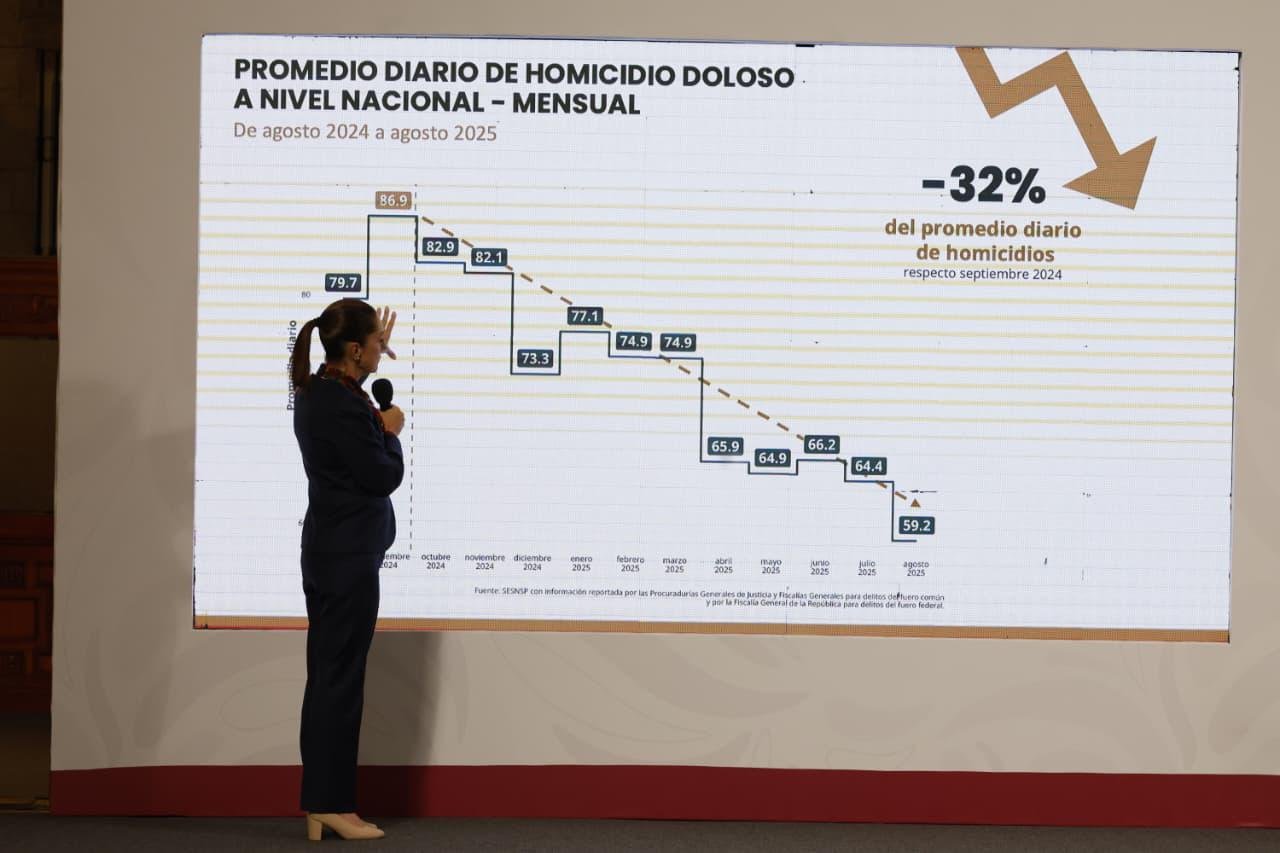 En el primer año de gobierno de la presidenta Claudia Sheinbaum Pardo, el homicidio doloso disminuyó en 32 por ciento, es decir, entre septiembre de 2024 y septiembre de 2025 cada día se cometieron 27 homicidios menos.