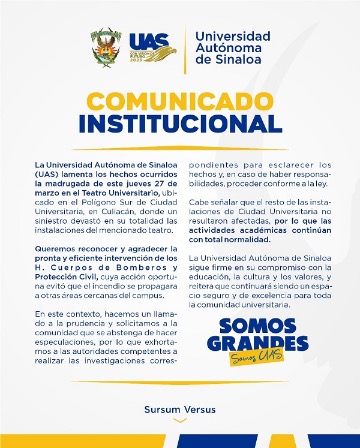 A través de un comunicado, la UAS hizo un llamado a la comunidad a no especular sobre las posibles causas del incendio, al tiempo que solicitó a las autoridades realizar las investigaciones necesarias para esclarecer los hechos y proceder conforme a la ley en caso de hallar responsables.