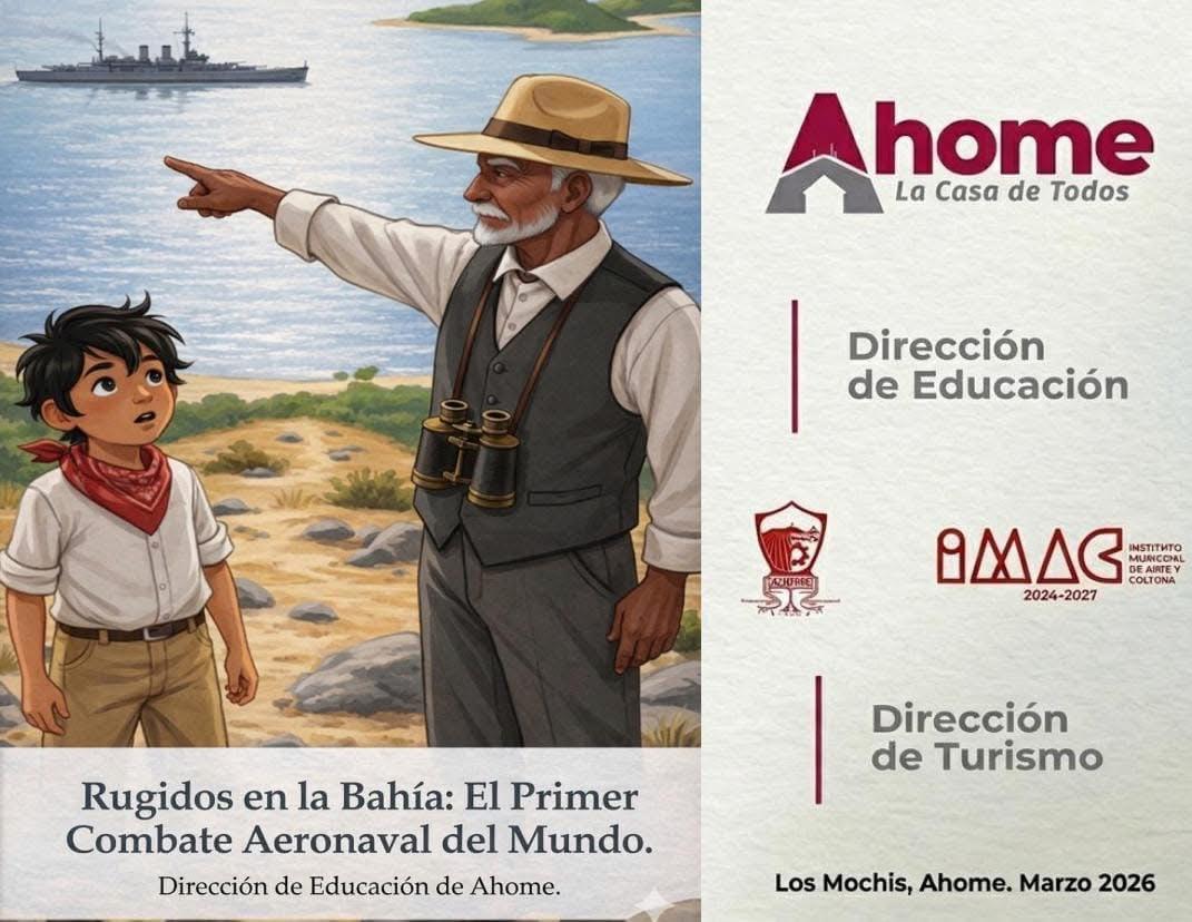 Los Mochis, Ahome, Sinaloa. A 24 de Marzo de 2026.- En el marco del 112 aniversario de la primera batalla aeronaval del mundo, ocurrida el 14 de abril de 1914 en el puerto de Topolobampo, el Gobierno de Ahome que preside el Alcalde Antonio Menéndez de Llano Bermúdez, a través de las dependencias de Arte y Cultura, Educación y Turismo, invitan a los estudiantes de nivel básico a participar en el concurso de dibujo y cuento, “Rugidos en la Bahía”, bajo la temática de ese hecho histórico.