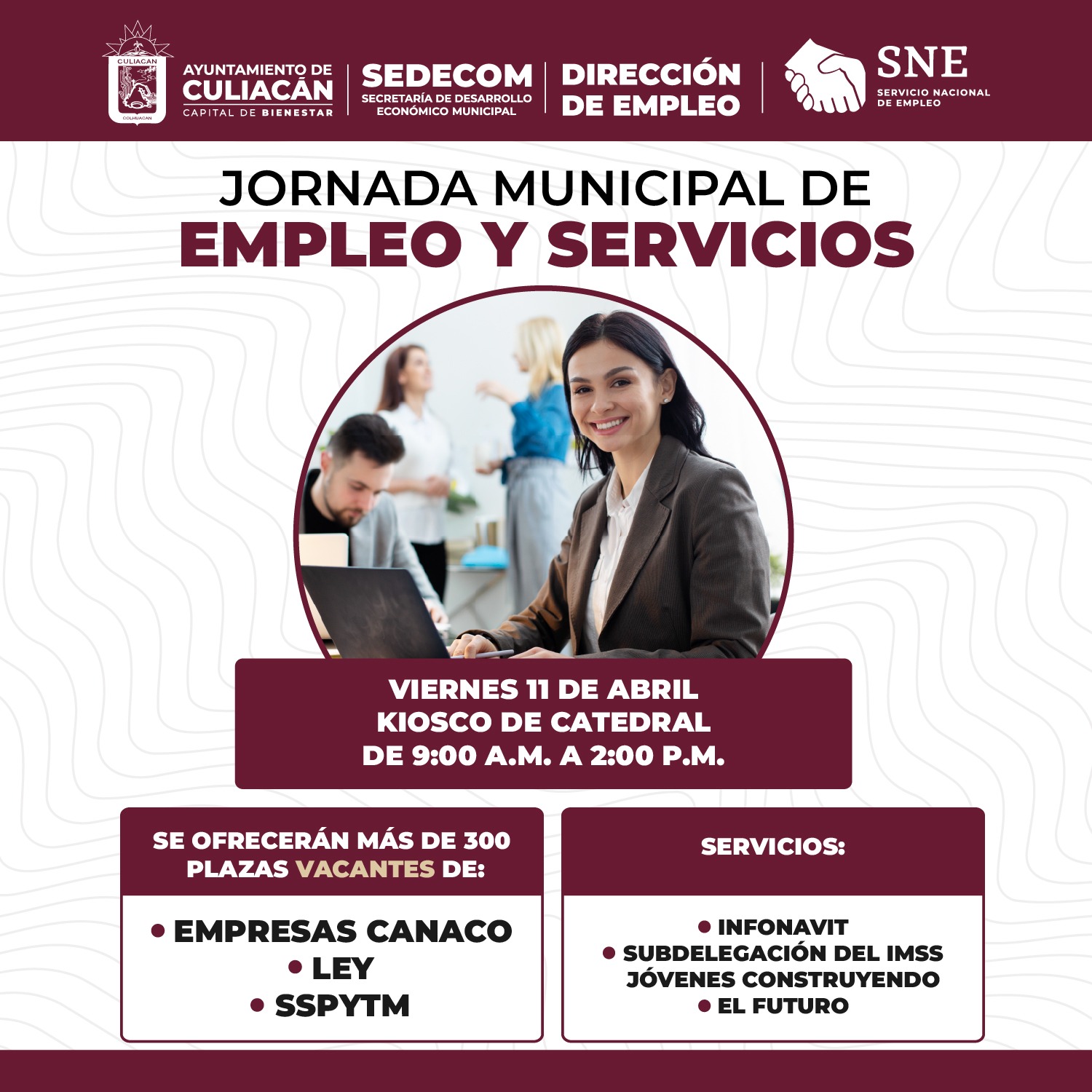 Culiacán, Sin., a 10 de abril de 2025.- Con una amplia oferta laboral, este viernes 11 de abril se llevará a cabo la Jornada Municipal de Empleo y Servicios, en la plazuela Álvaro Obregón, a un costado de la Catedral, en un horario de 9:00 a.m. a 2:00 p.m.