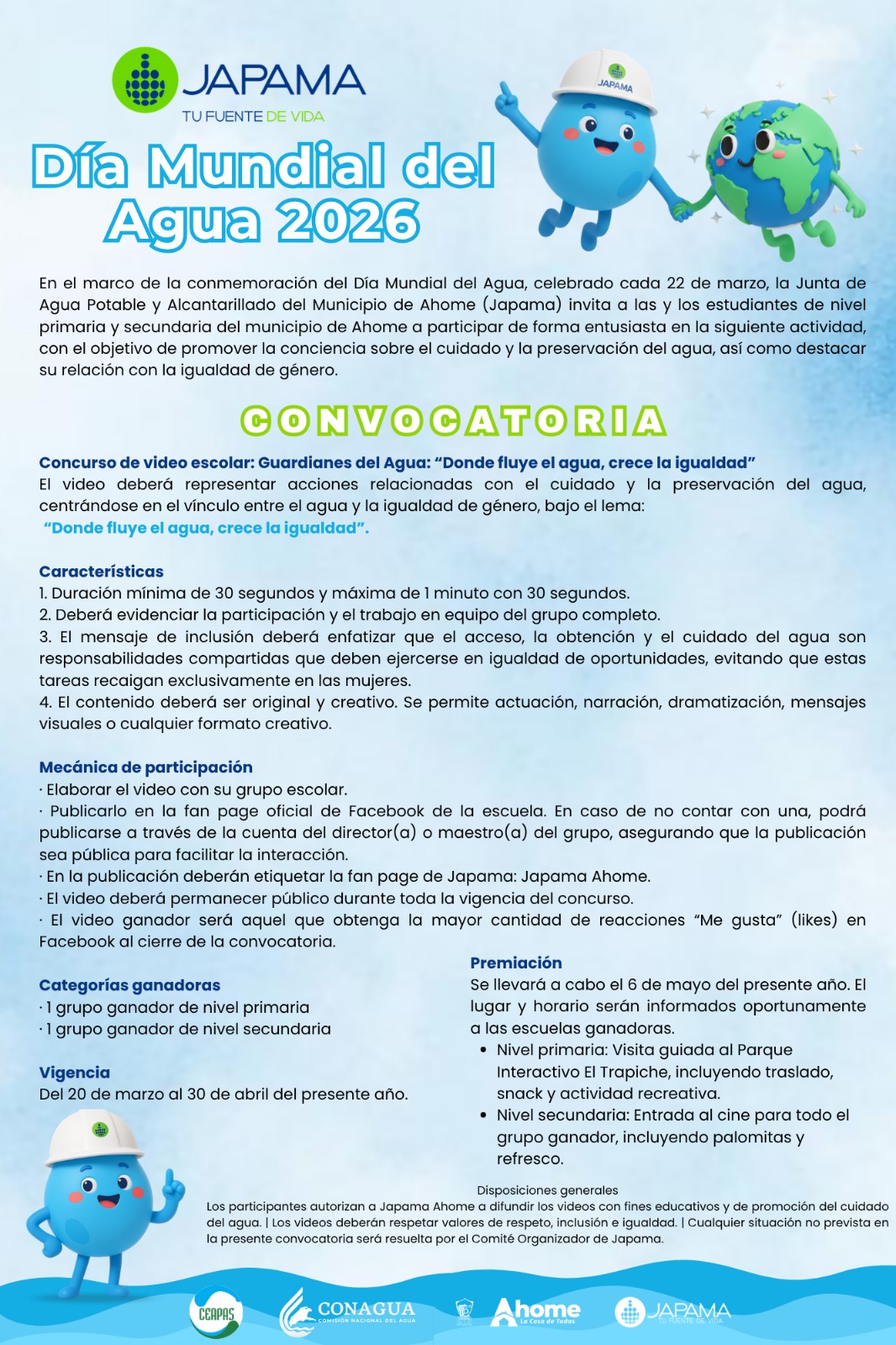 La Junta de Agua Potable y Alcantarillado del Municipio de Ahome (JAPAMA) lanza un llamado a todas las escuelas primarias y secundarias del municipio de Ahome para que continúen participando en el concurso “Guardianes del Agua: Donde fluye el agua crece la igualdad”, cuya vigencia estará disponible hasta el próximo 30 de abril, con premiación programada para el 6 de mayo.