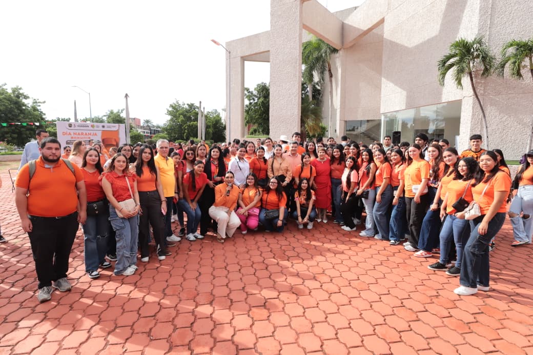 En el evento, en la explanada del Auditorio Héroes de Sinaloa, los asistentes formaron un lazo naranja humano, como símbolo de fortaleza y unidad.